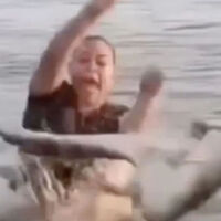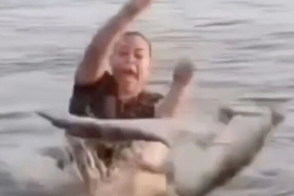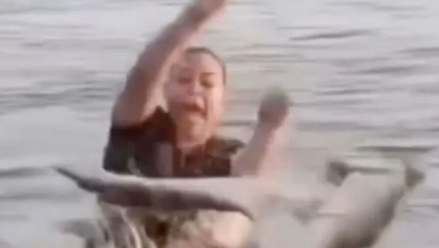 На кадрах видно, как женщина спокойно находится в воде и, судя по всему, не замечает дрейфующий рядом объект. В какой-то момент она касается предмета, похожего на бревно, после чего в панике вскрикивает.