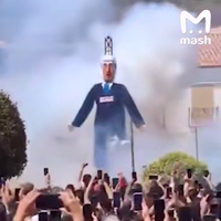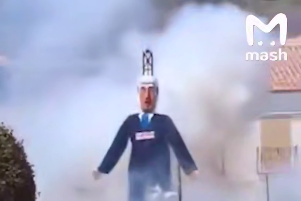 На кадрах чучело сначала подожгли, а потом раздались взрывы и фигуру разорвало на части. Собравшиеся на акции встретили разрушение чучела аплодисментами.