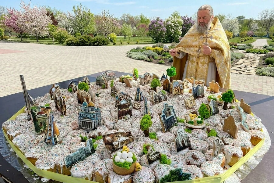 Праздничная программа включала освящение кулича и дегустацию для посетителей с возможностью сфотографироваться на фоне гигантского десерта.