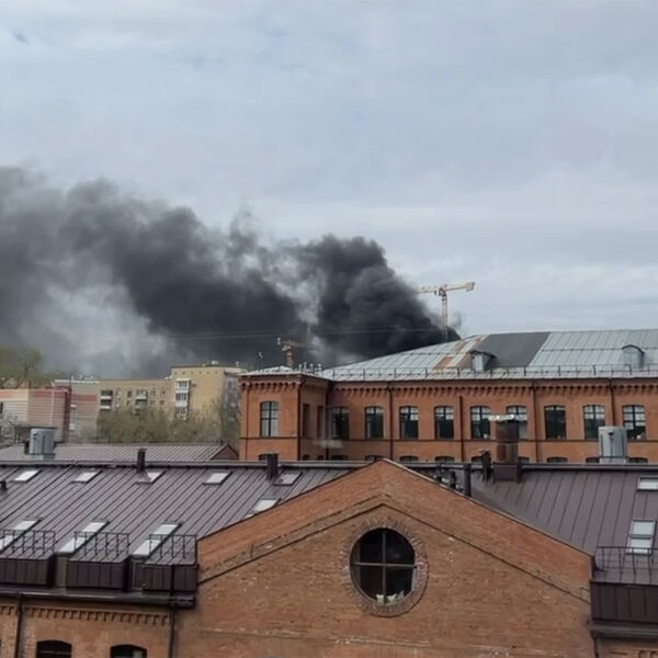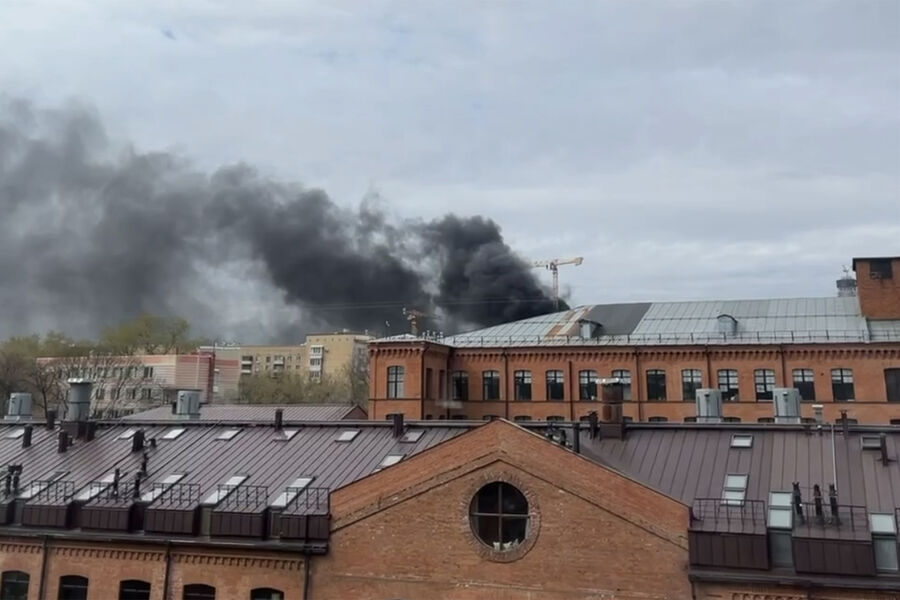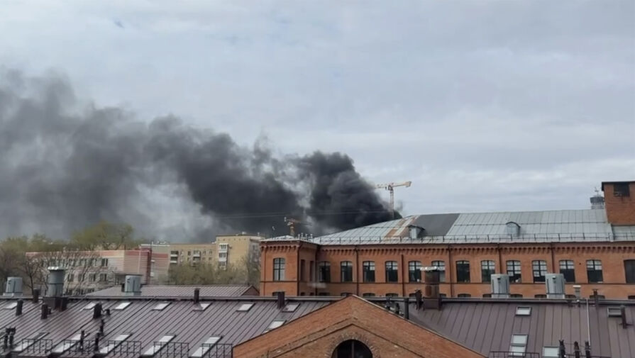Материал дополнен кадрами с места ЧП. На них запечатлен густой черный дым, поднимающийся над красными зданиями.