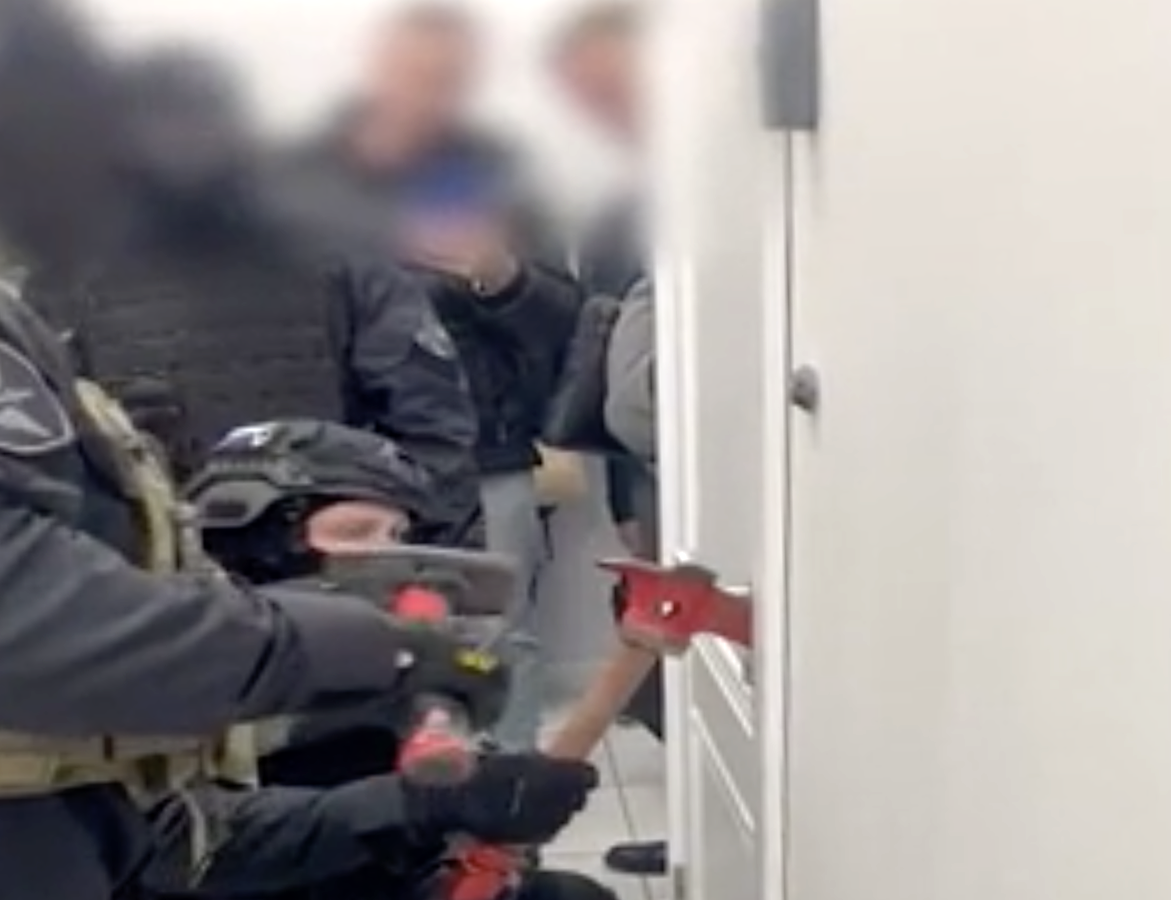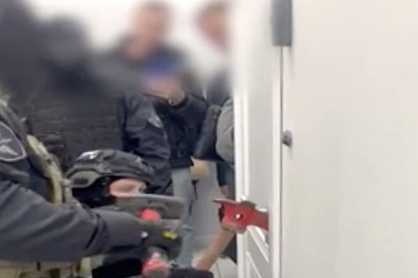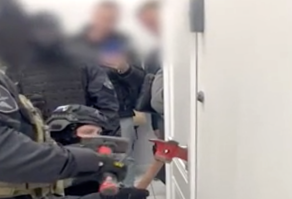 На записи можно увидеть, как один из стражей порядка держит топор, а второй бьет по нему кувалдой. За кадром слышна просьба «Попробуй с минимальным ущербом». Удары продолжались до тех пор, пока топор достаточно глубоко не вошел в дверь. После чего оперативники смогли ее взломать.