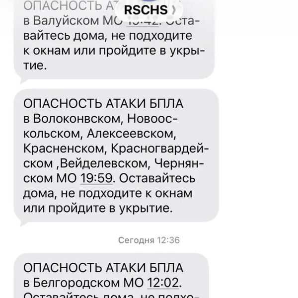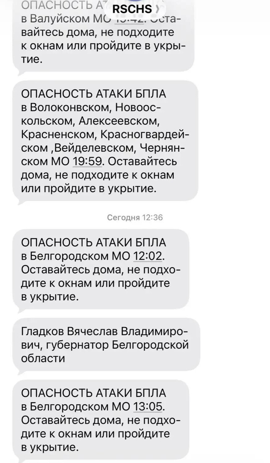 Губернатор Белгородской области Вячеслав Гладков сообщил, что жителям региона пришло сообщение от РСЧС (Единой государственной системы предупреждения и ликвидации чрезвычайных ситуаций) с упоминанием его имени. Он отметил в своем Telegram-канале, что это может быть фейк или технический сбой.