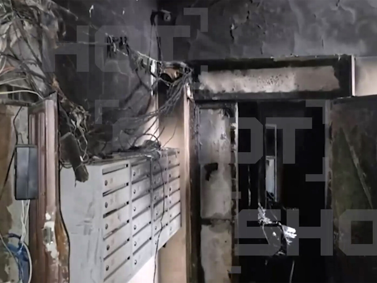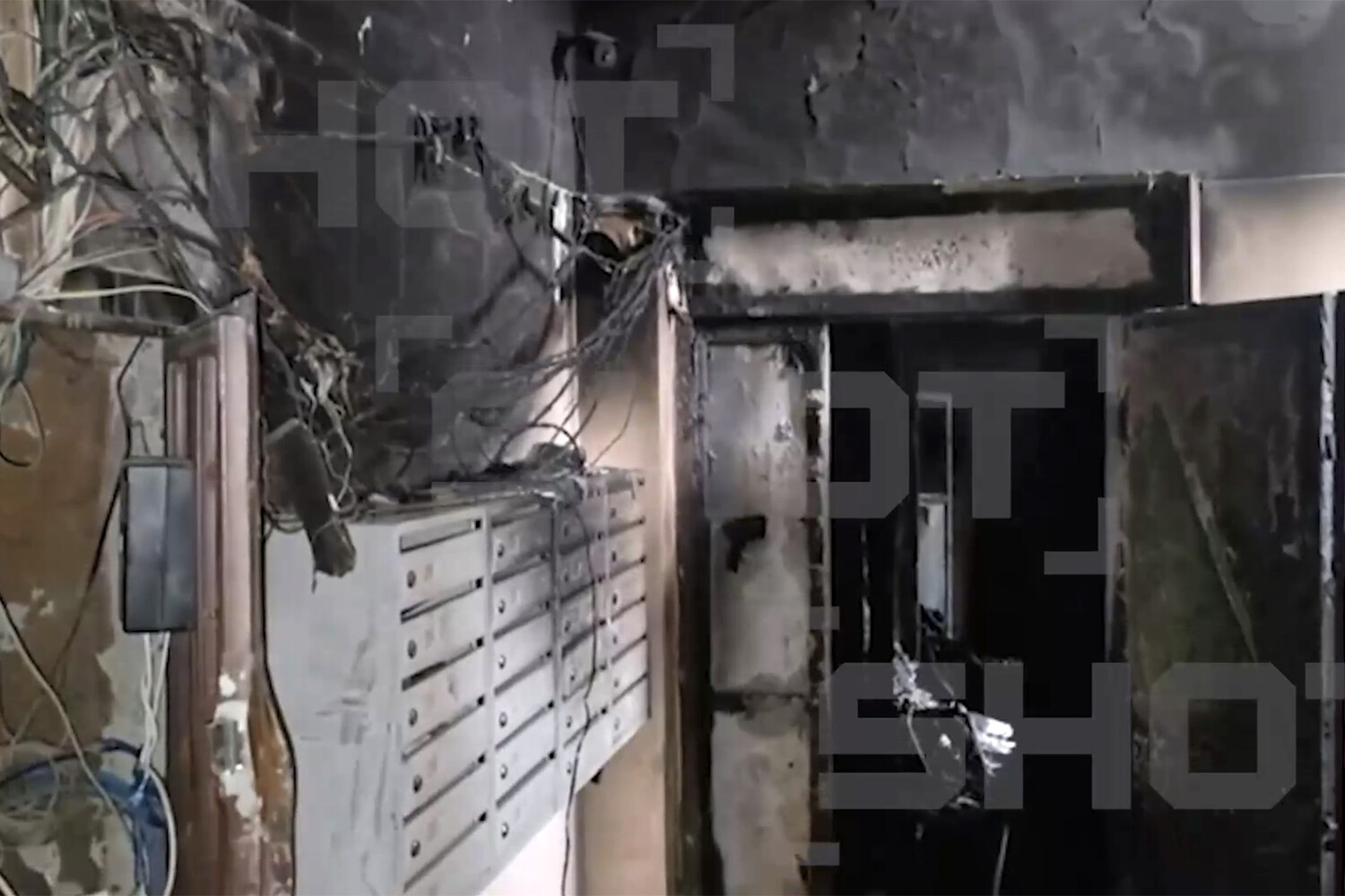 На кадрах с места заметно, что квартира выгорела, часть предметов тоже. Также последствия пожара заметны на проводке около входной двери и почтовых ящиков, которые находятся около жилья.