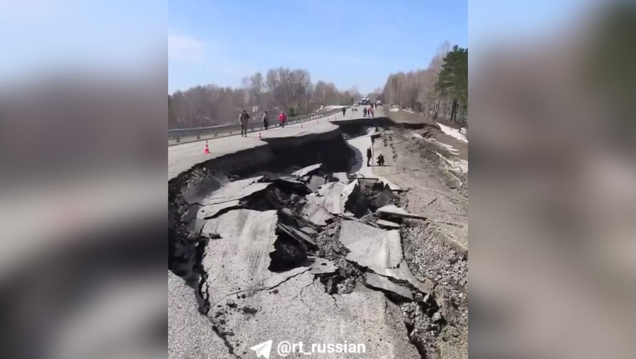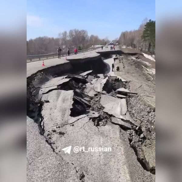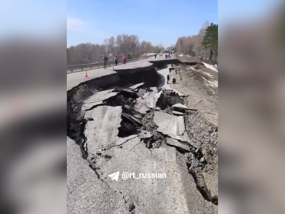 Появились кадры с места обрушения трассы в Новокузнецком округе Кемеровской области. Они появились в Telegram-канале RT.