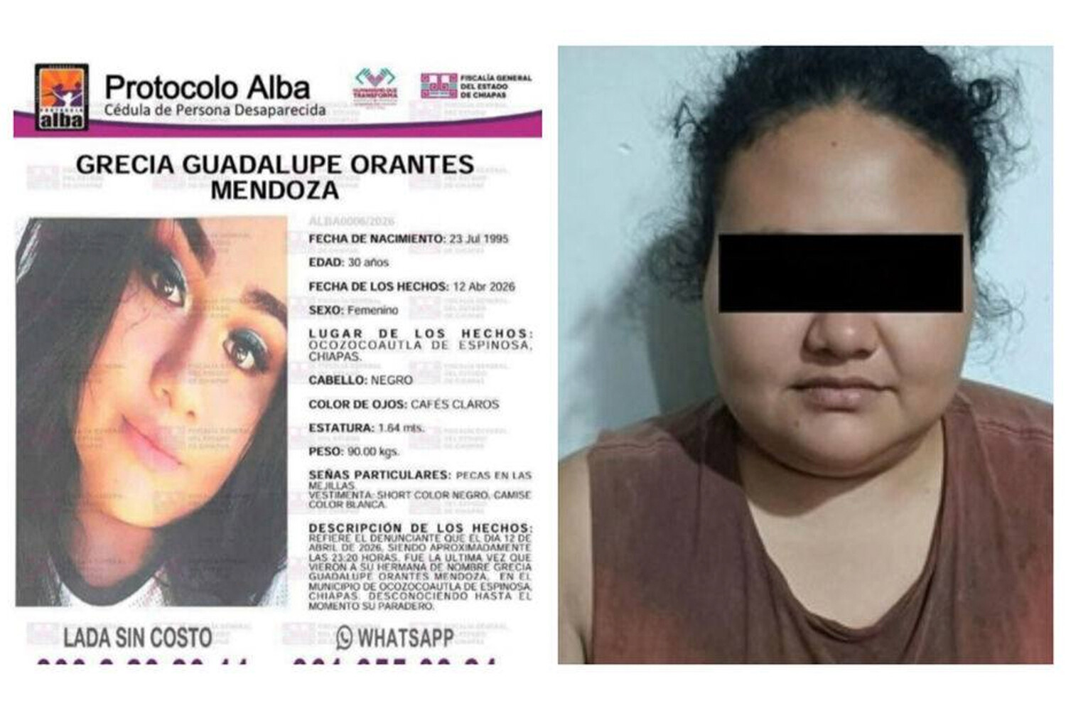 Гресии Гваделупе Орантес Мендоса исчезла в ночь на 12 апреля 2026 года в муниципалитете Окосокоаутла-де-Эспиноса. Семья подала заявление, после чего полиция активировала протокол «Альба» — механизм немедленного поиска пропавших женщин. Для создания плакатов правоохранители использовали фотографии женщины из ее социальных сетей.