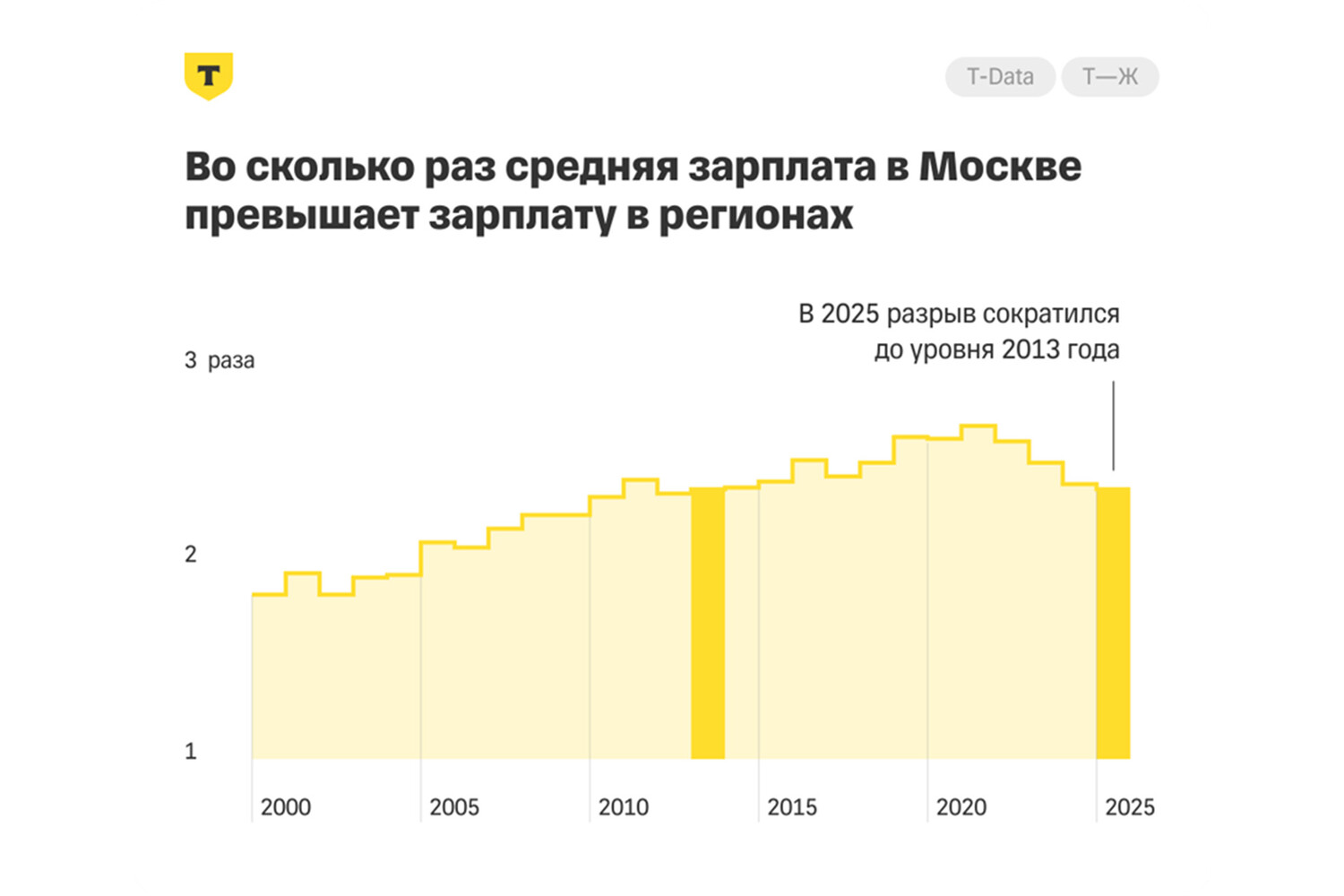 Но если смотреть не на номинальную разницу в рублях, а на соотношение зарплат, то выяснилось, что разрыв в последние годы, наоборот, сокращается. Если в 2021-м работник в Москве в среднем получал в 2,72 раза больше, чем житель провинции, то в 2025-м — уже в 2,39 раза.