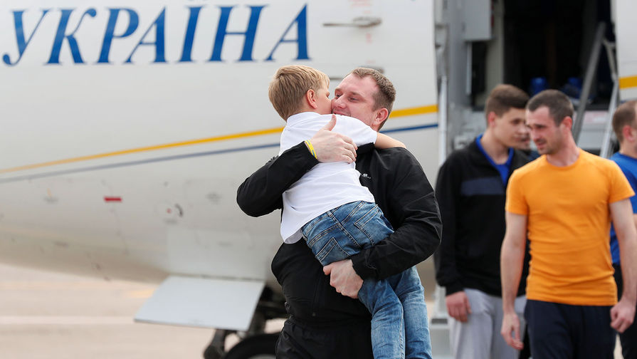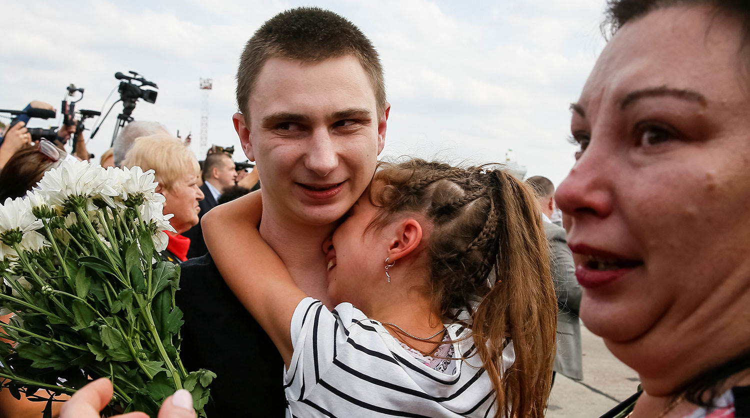 Президент Украины Владимир Зеленский, глава Офиса президента Андрей Богдан и освобожденный режиссер Олег Сенцов, обнимающий дочь Алину (справа), в аэропорту Борисполя, 7 сентября 2019 года Руководитель портала «РИА Новости Украина» Кирилл Вышинский (в центре) и генеральный директор МИА «Россия сегодня» Дмитрий Киселев в аэропорту Внуково, 7 сентября 2019 года Борт с участниками обмена с Россией приземлился в аэропорту Борисполя, 7 сентября 2019 года Российский Ту-204 доставил участников договоренности об освобождении между Россией и Украиной, 7 сентября 2019 года Руководитель портала «РИА Новости Украина» Кирилл Вышинский (в центре) в аэропорту Внуково Борт с участниками обмена с Россией приземлился в аэропорту Борисполя, 7 сентября 2019 года Член экипажа кораблей ВМС Украины Вячеслав Зинченко в аэропорту Борисполя, 7 сентября 2019 года Российский Ту-204 доставил участников договоренности об освобождении между Россией и Украиной, 7 сентября 2019 года Освобожденный в рамках обмена России и Украины режиссер Олег Сенцов выходит из самолета в аэропорту Борисполя, 7 сентября 2019 года Российский Ту-204 доставил участников договоренности об освобождении между Россией и Украиной, 7 сентября 2019 года Родственники освобожденных в России украинцев ждут их прибытия в аэропорту Борисполя, 7 сентября 2019 года