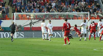 Голевая комбинация началась анекдотически. Моизес бежал за мячом вдоль бровки, но вдруг, поскользнувшись, упал. На беду бразильца где-то за спиной у него пробегал и Лекхето, который, воспользовавшись слабой координацией в движениях Моизеса, подхватил мяч, вошел в штрафную и сделал передачу в центр. Когда казалось, что передача Лекхето уже не найдет адресата, из центра поля прибежал Игнашевич, который с ходу вколотил мяч в нижний угол ворот Баги. Защитник, ставший главным героем встречи Швейцария--Россия, забил, таким образом, уже третий мяч в двух матчах.