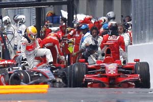 Выезжая оттуда диспозиция была следующей: Кубица, Ряйккенен, Хэмилтон, Росберг. Роберт, увидев красный свет на выезде с пит-лейна, притормозил, поравнявшись с ним остановился и Кими, а Льюис на полном ходу протаранил болид «Феррари».
