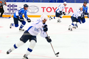 «Динамо» перед своим болельщиками начало очень бодро: 2:0 к четвёртой минуте — Анкипанс в большинстве и Госса. Причём хозяева не сбавили оборотов до самого перерыва, они продолжали наседать на ворота россиян и имели несколько очень хороших моментов. «МВДшники» всё же выстояли и под занавес первого периода выровняли игру.