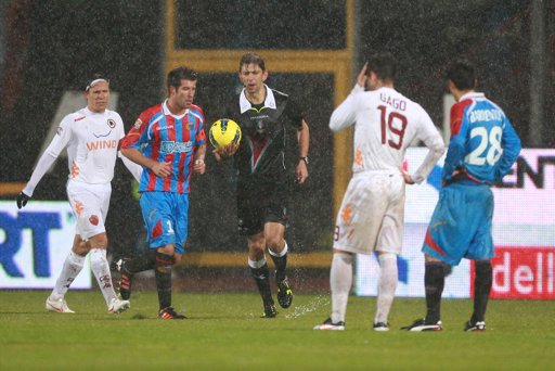 После перерыва игра напомнила приснопамятную встречу нынешнего сезона чемпионата России «Крылья Советов» — «Динамо», ибо мяч застревал в луже чуть ли не на каждом метре газона. Только происходившее на поле «Анджело Массимино» представляло собой версию «лайт» вышеупомянутого события. Дабы сохранить своих лидеров в здравии, Луис Энрике сразу же отправил на скамейку Де Росси и Тотти.