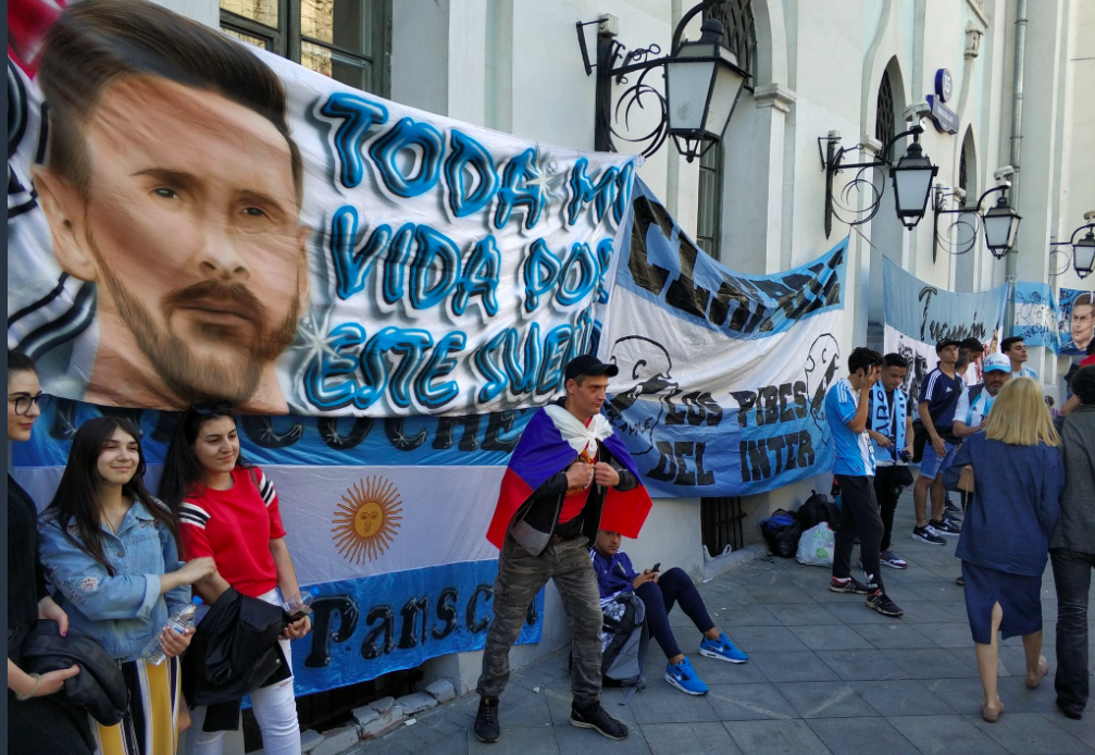 Главная жара происходила на Никольской улице. Еще до открытия чемпионата это место стало настоящим центром фанатского движения. Аргентинцы организовали мини-штаб, завесив фасад одного из зданий плакатами с национальной символикой и фотографиями игроков. На портретах был не только Месси. Нашлось место и для нападающего «Ювентуса» Паоло Дибалы.