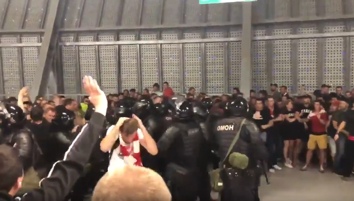 Ранее болельщики красно-белых разместили в социальных сетях видеоролики, на которых они толкаются с контролерами стадиона, скандируя «Один за всех и все за одного!», а затем начинается конфликт с омоновцами, которые отгоняют толпу от стюардов, попутно нанося удары некоторым фанатам дубинками.