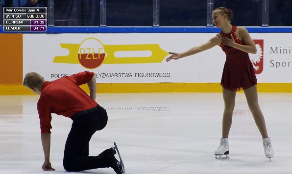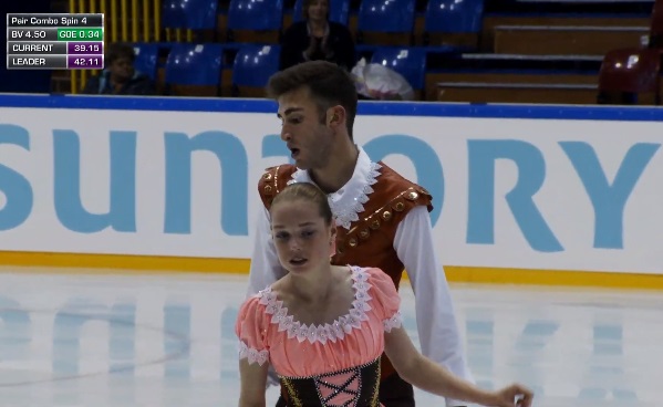 Не все получилось у грузинского дуэта, который сразу же начал с ошибки на параллельном прыжке. Хотя в целом программа сложная и интересная. Например, они делают четвертый уровень тройного твиста! Это огромная редкость для юниорского катания.