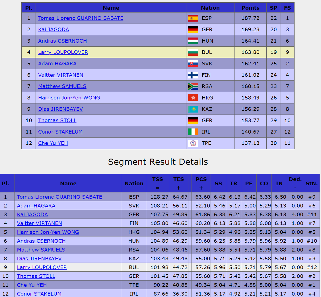 Болгарский фигурист получает за свой прокат 101,98 балла, что дает ему в общей сумме 163,80 балла и четвертое промежуточное место.