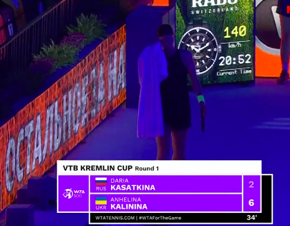 Калинина на подаче. Украинка так мощно подала, что Касаткина с трудом отбила мяч — тот взмыл «свечой». В итоге украинка вышла к сетке и спокойно отправила мяч в недосягаемую для россиянки часть корта — 15:0.