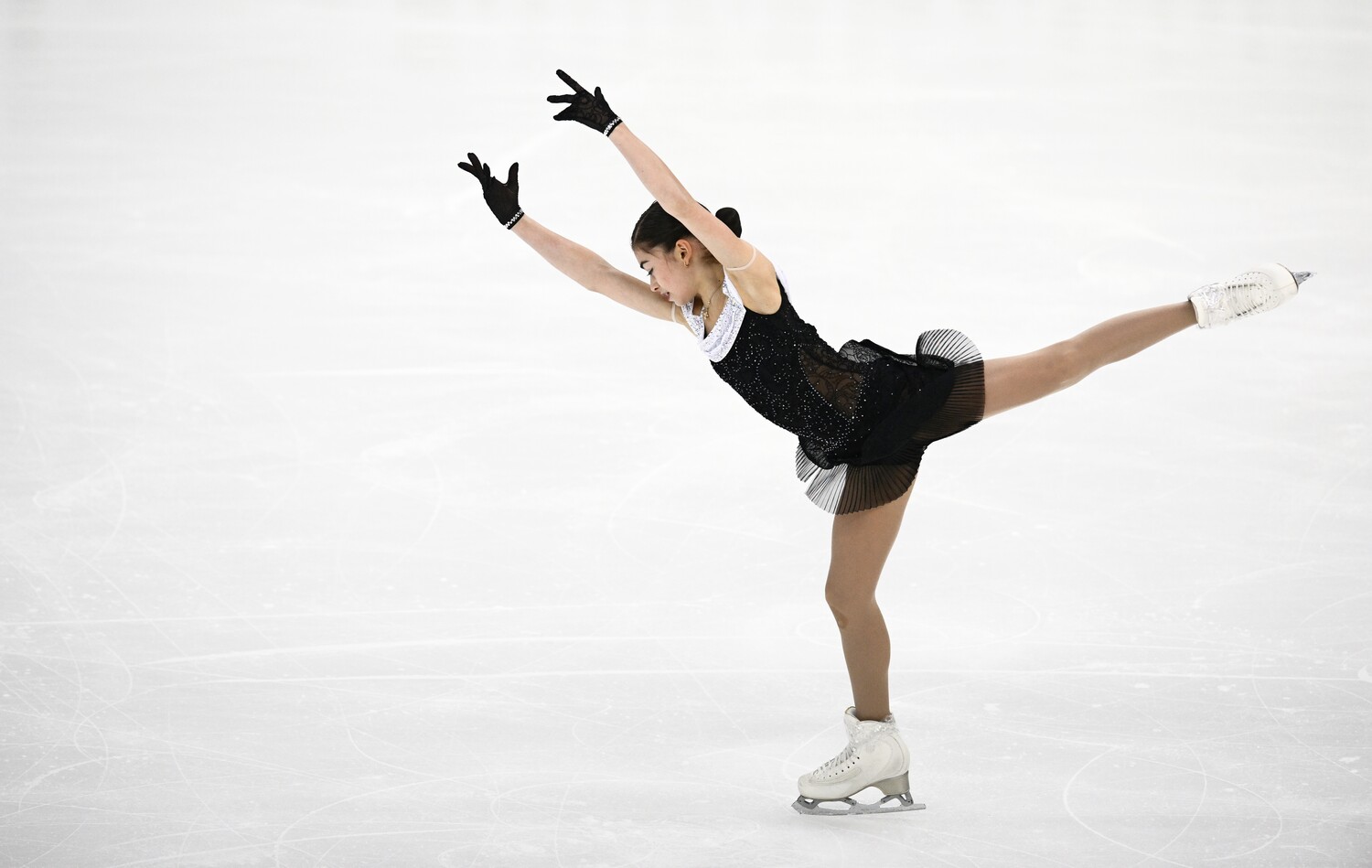 Александра Трусова выходит на свой первый официальный старт после Олимпиады под руководством Светланы Соколовской. Под музыку Indila — Ainsi bas la vida выступает она.