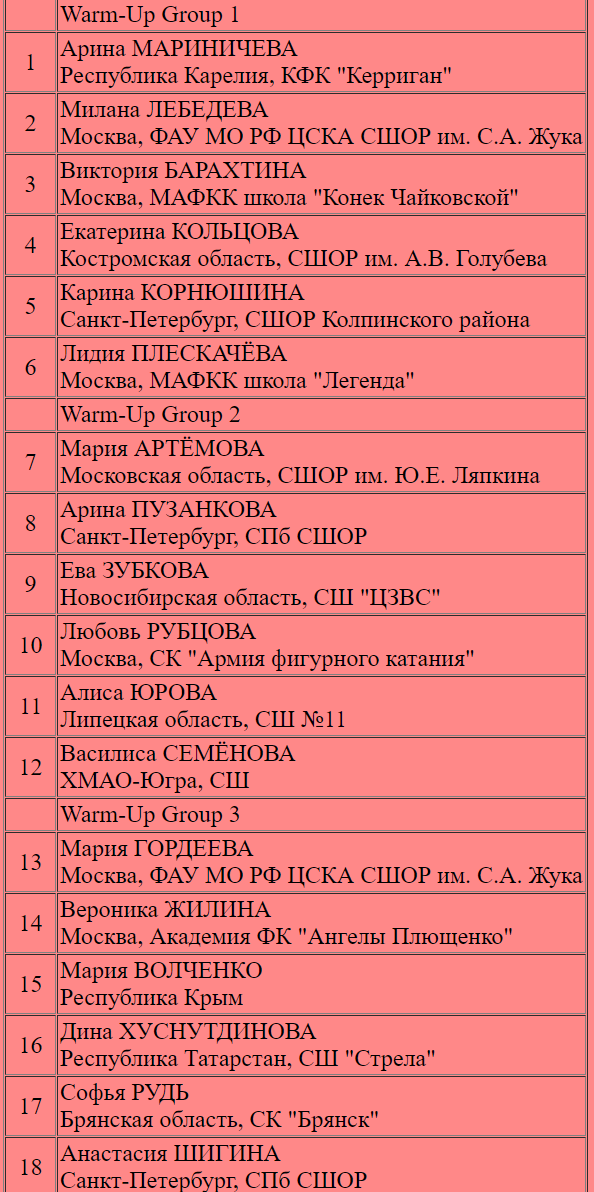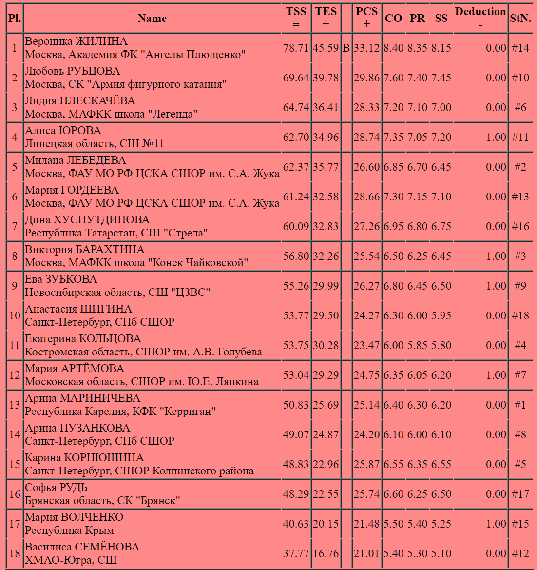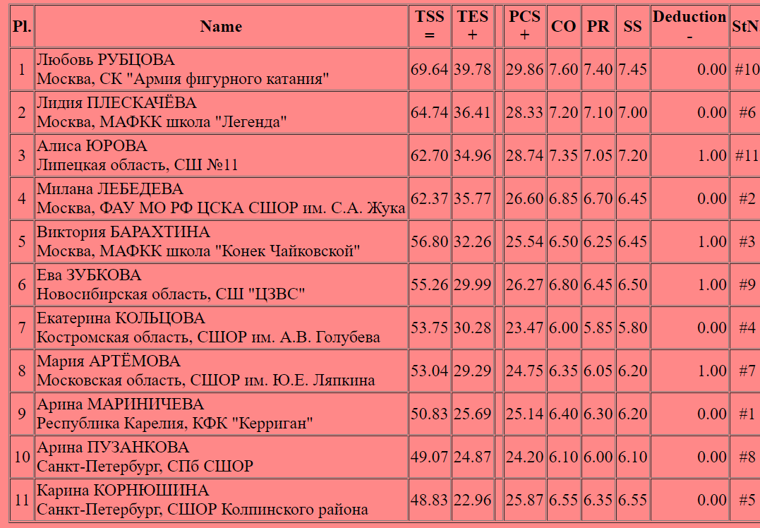 Начинает Рубцова с чистого и уверенного двойного акселя, очень легко ей дался этот прыжок. Следом также спокойно она исполняет тройной риттбергер. Вращения исполнены в быстром темпе и весьма заслуженно получают четвертый уровень. С каскадом тройной лутц + тройной тулуп Рубцова тоже справляется без проблем. Практически эталонное выступление демонстрирует фигуристка.
