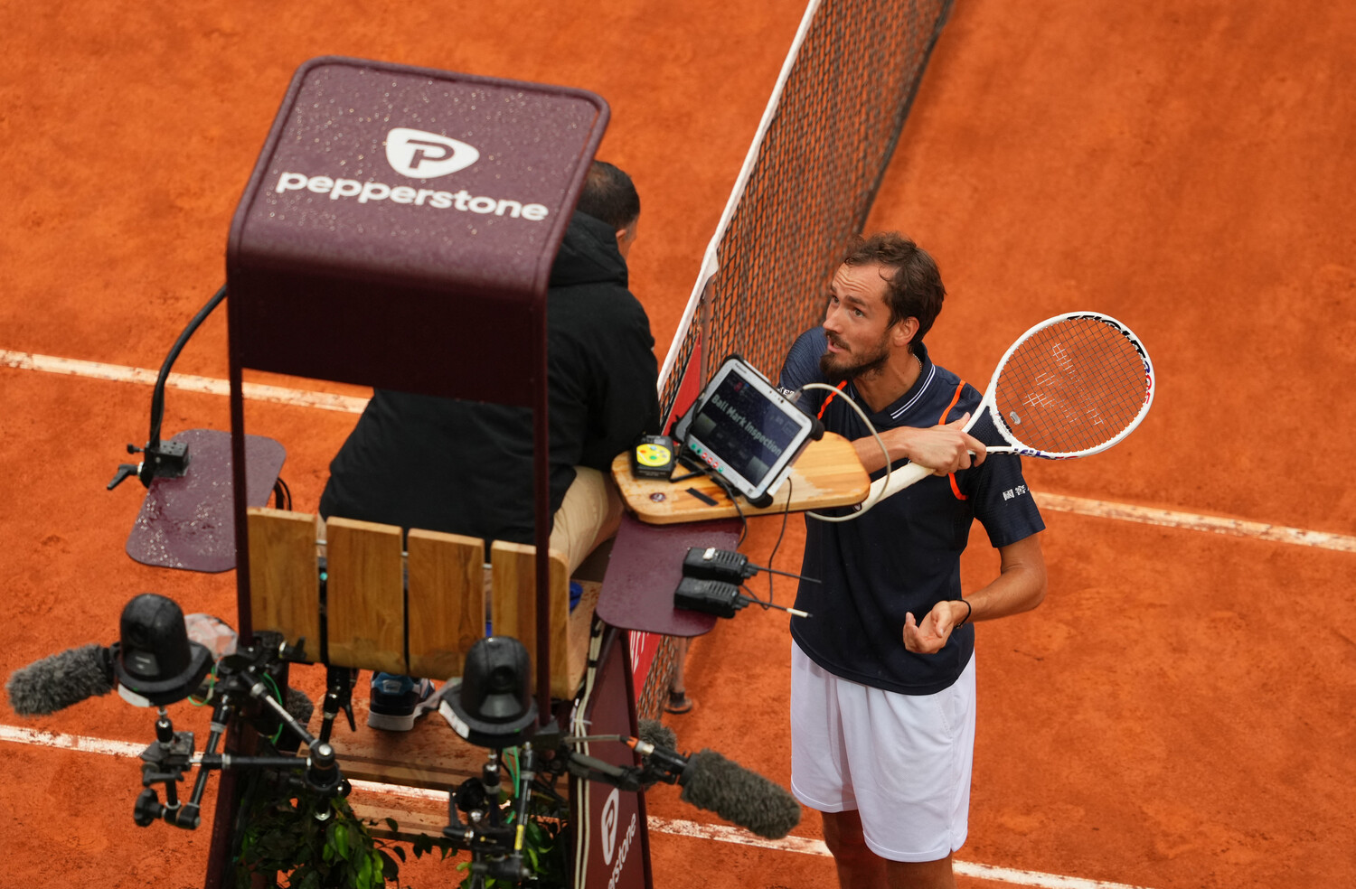 Медведев, считавший, что грек не попал, ругается с подтвердившим попадание арбитром на вышке Мохаммедом Лайани, известным шоуменом.
