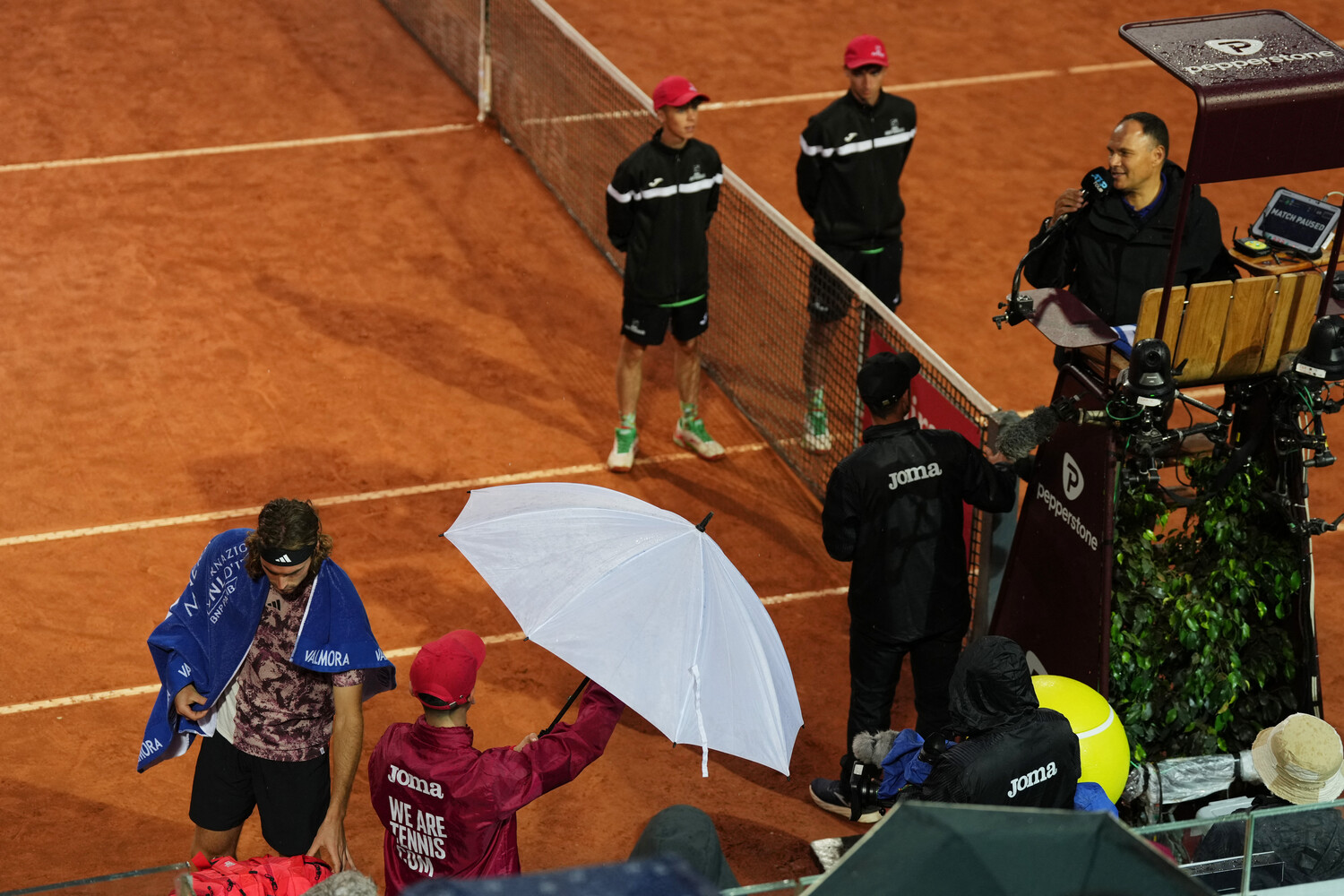 Напомним, что в матче идет первый счет, счет 4:4. Последним перед остановкой подавал Медведев, но Циципас сделал брейк.