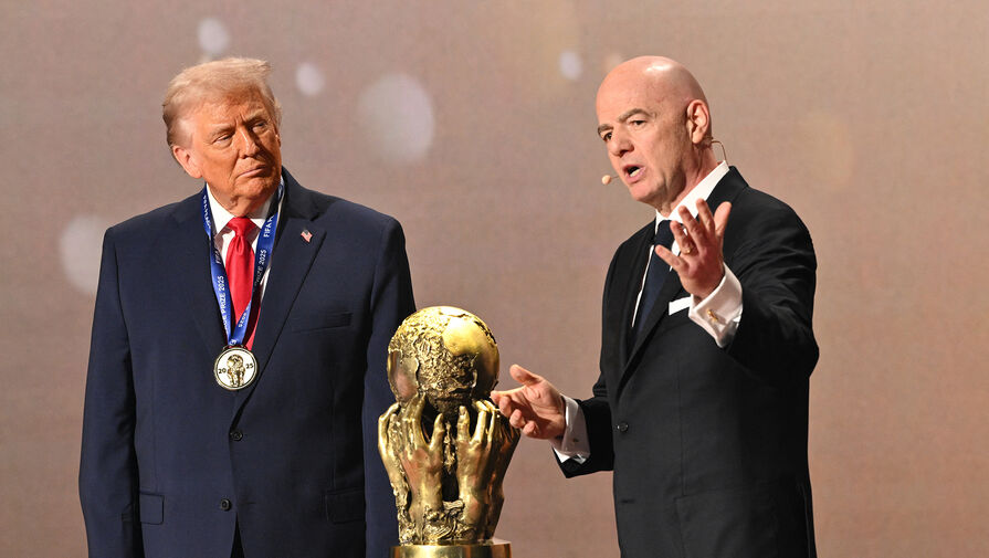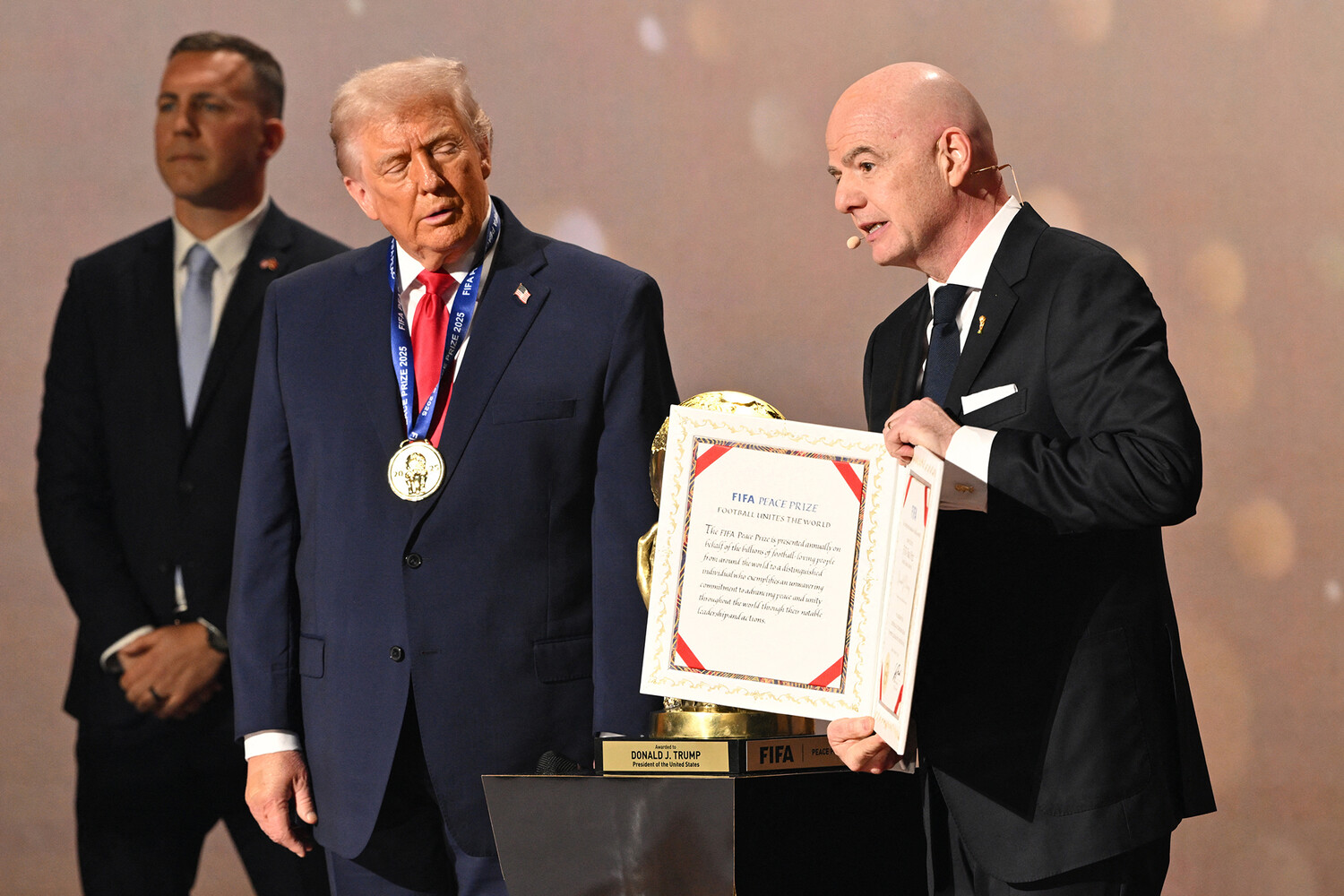 Президент США Дональд Трамп на сцене с президентом ФИФА Джанни Инфантино во время церемонии вручения ему Премии мира ФИФА