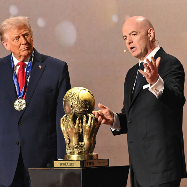 Джанни Инфантино вручает Дональду Трампу специально учрежденный приз — приз мира ФИФА! Аериканский президент получает статуэтку и золоту. медаль, которую вполне можно будет принять как медаль за победу на предстоящем турнире.