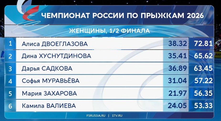 Открывает соревнования у женщин Софья Муравьева, не все получилось чисто, из-за чего результат вышел не таким, на который, возможно, спортсменка рассчитывала — 31,04 балла.