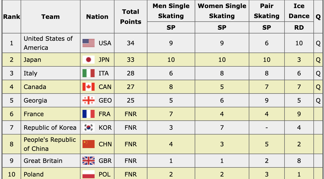 Таблица командного турнира по итогам коротких программ (нажмите на картинку, чтобы увидеть полностью):