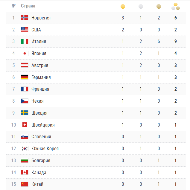 Подводим итоги второго дня Олимпиады-2026. Вот так выглядит общий медальный зачет.