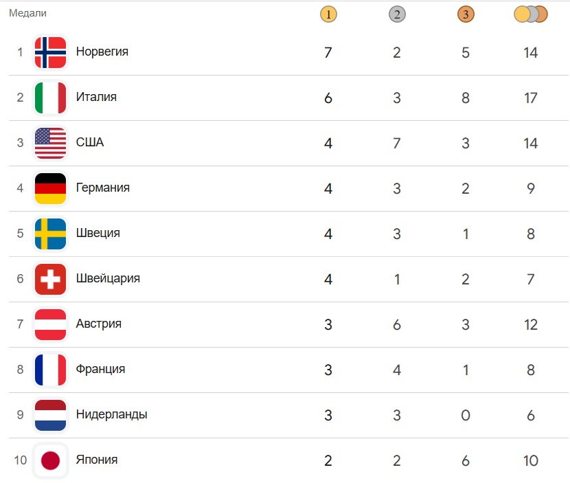 Таким получился шестой день Олимпийских игр. Вот медальный зачет. Увидимся завтра.
