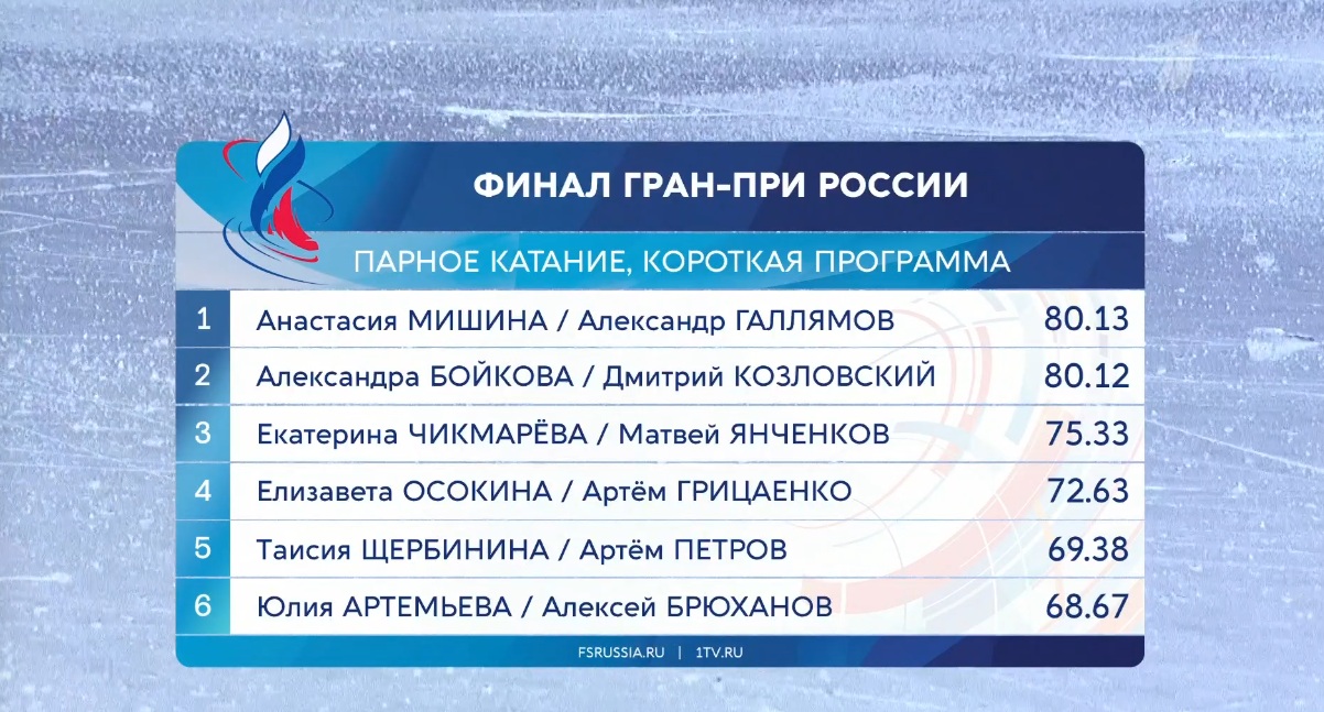 80,12 — второе место у Бойкова и Козловского, но уступили 0,01 Мишиной и Галлямову! Все решится в произвольной!