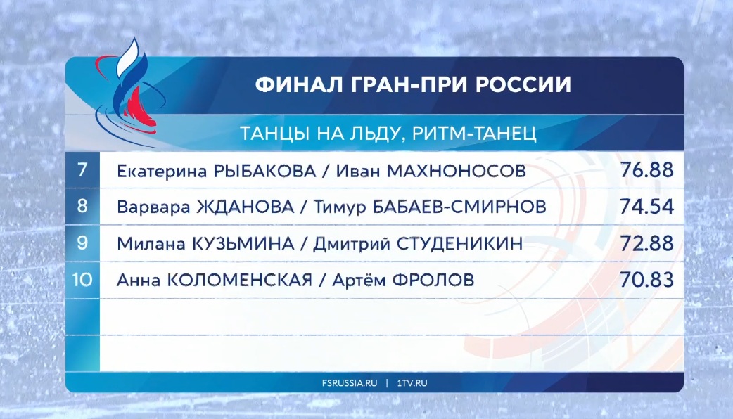 Вот положение по итогам короткой программы спортивных пар. Сейчас подготовка льда и дальше ритм-танец танцевальных дуэтов.