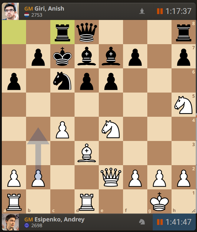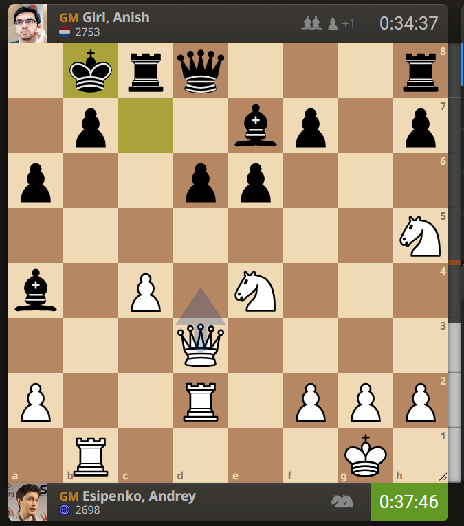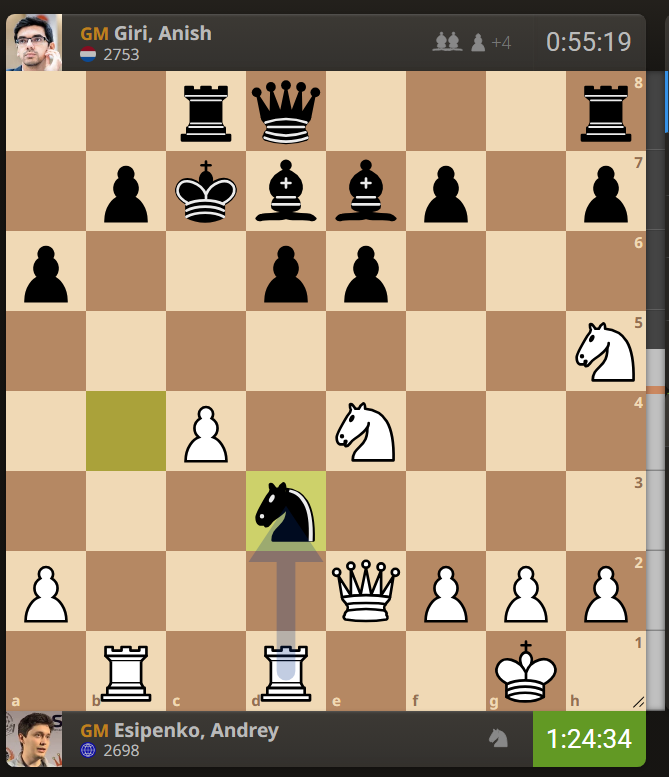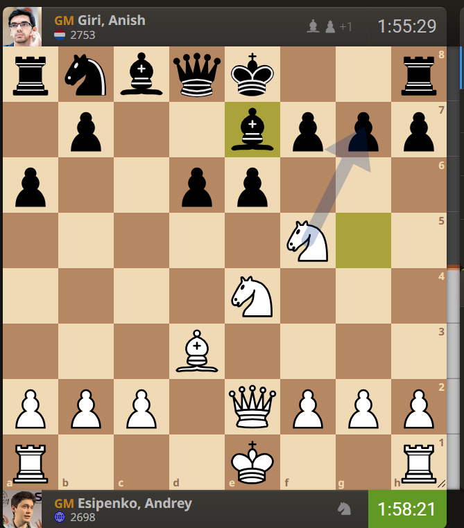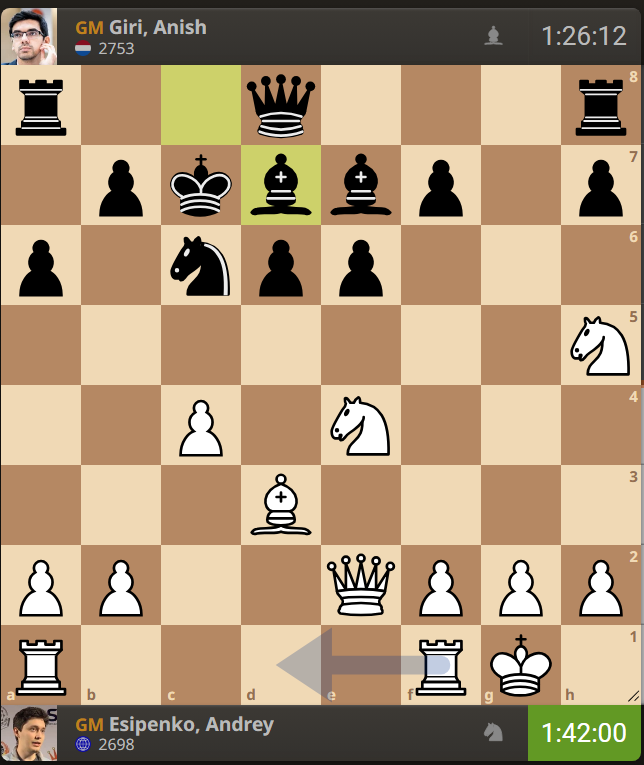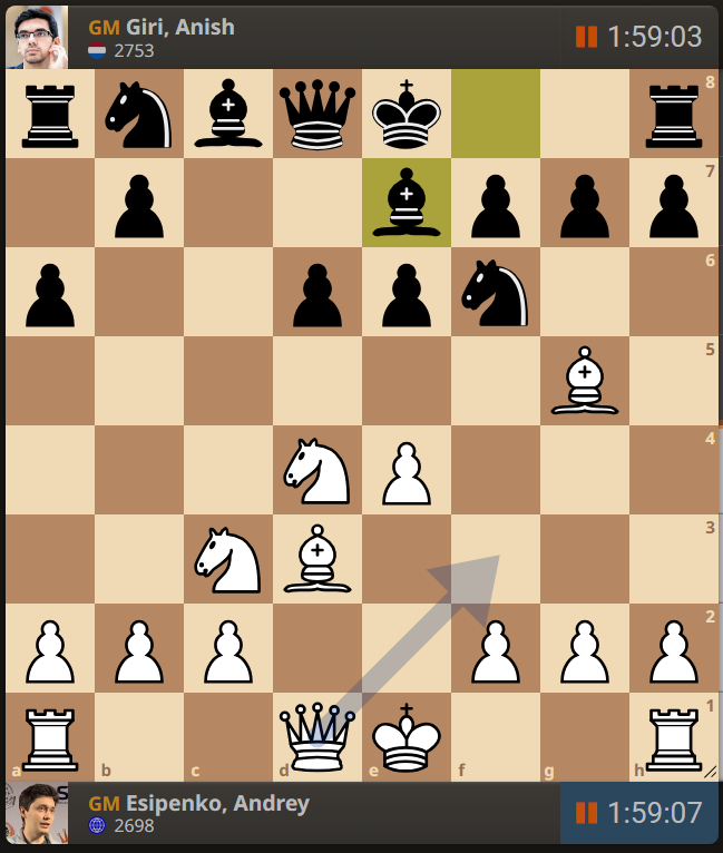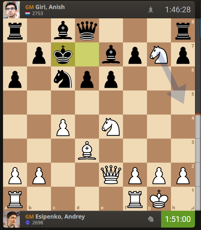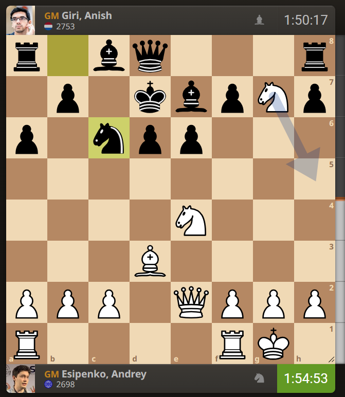 Почти полчаса обдумывал Гири свой ход, в итоге вышло вот так: 14. Nh5 Bd7.
