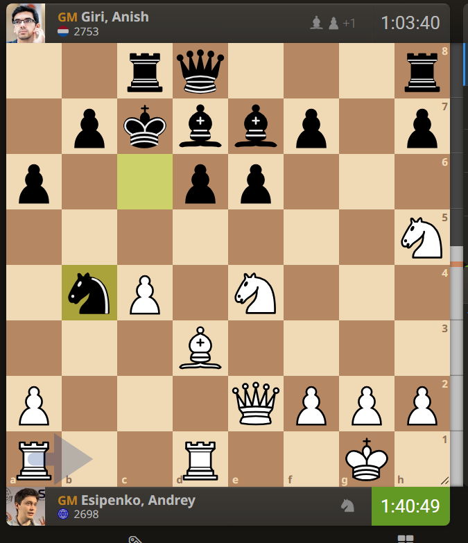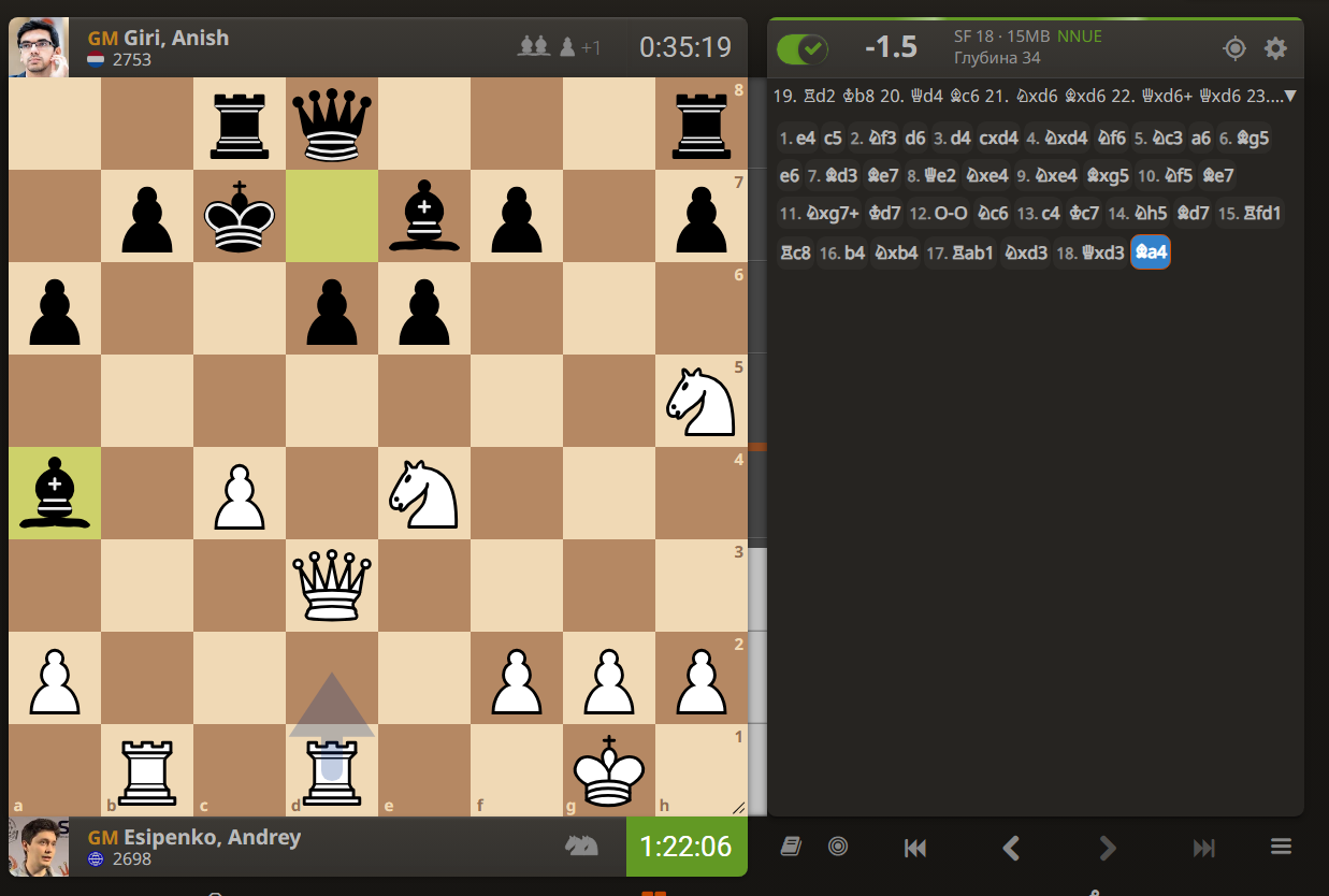 Небольшой перевес компьютер отдает Есипенко после первого часа с небольшим игры. 16. b4 Nxb4