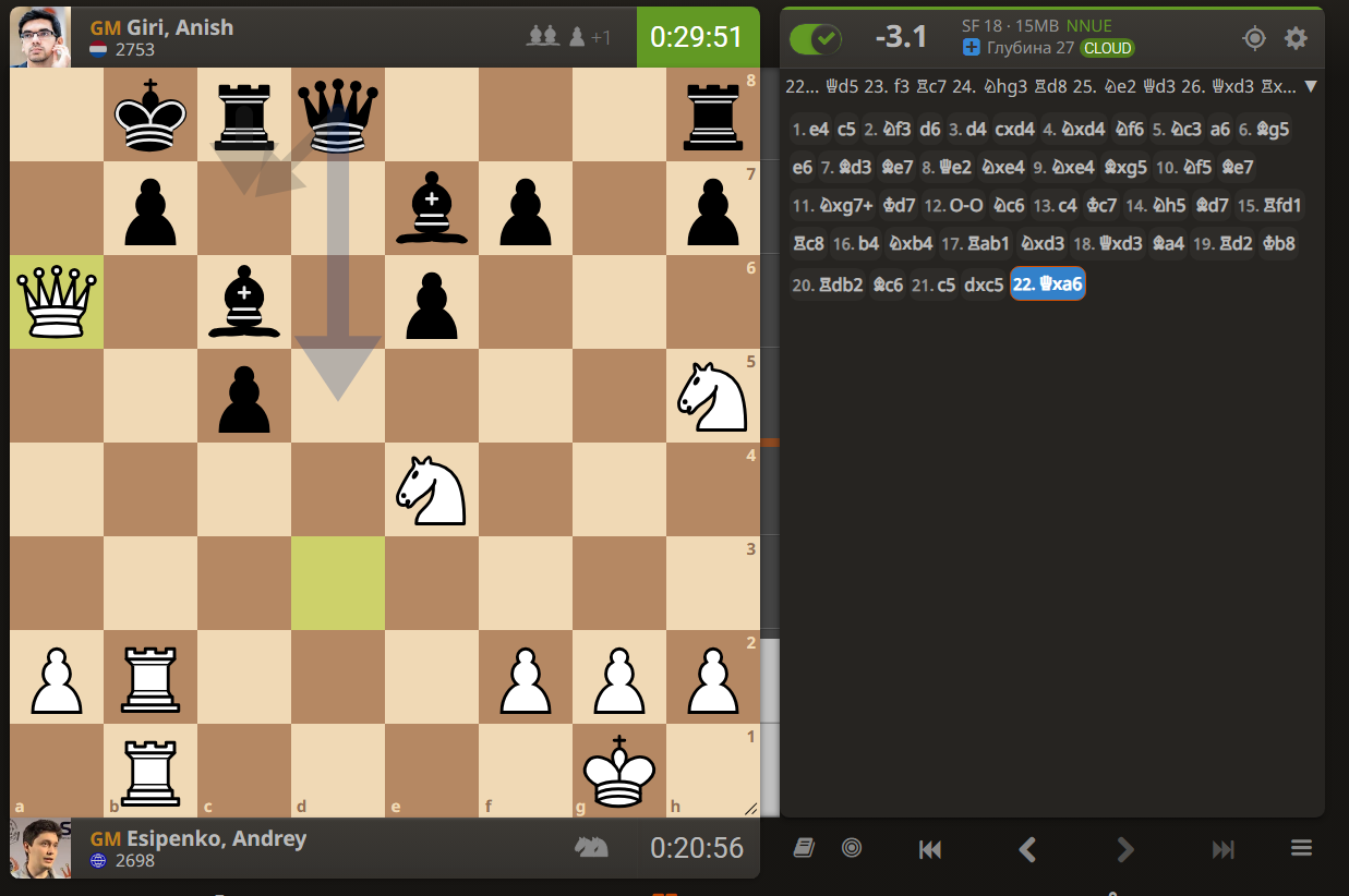 Оценка позиции у Гири только растет, позиция для атаки у черных великолепна.