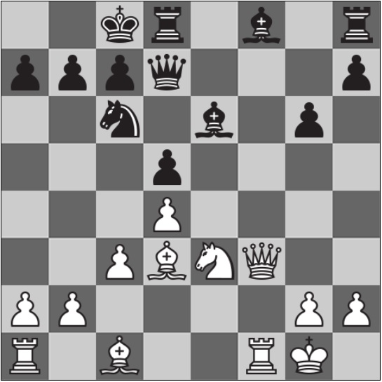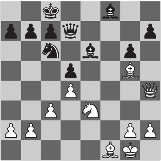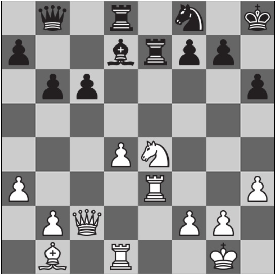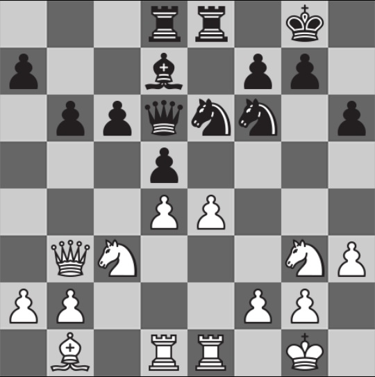 Равная позиция у Есипенко с Блюбаумом. Никто не может добиться перевеса. 15.Nc2 Bg7 16.Bg5 Rdf8 17.Qg3 Rxf1+ 18.Rxf1 Rf8 19.Qh4 Rxf1+ 20.Bxf1 Bf8 21.Ne3