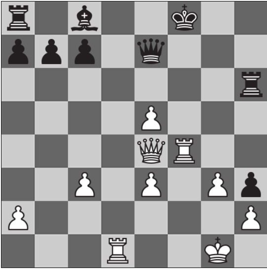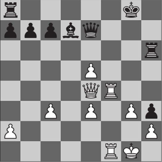 Естественно, этот ход последовал, и дальше Синдаров уверенно развивает свой перевес: 23.Rf7 Qxf7 24.Rxf7 Kxf7 25.Qf4+ Kg7 26.Qg5+ Kh7 27.Qe7+ Kg8 28.Qxd7 Rf8 29.Qg4+