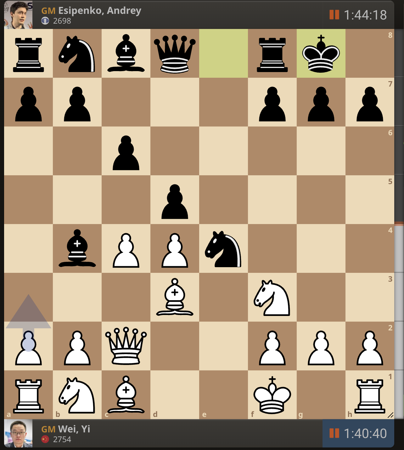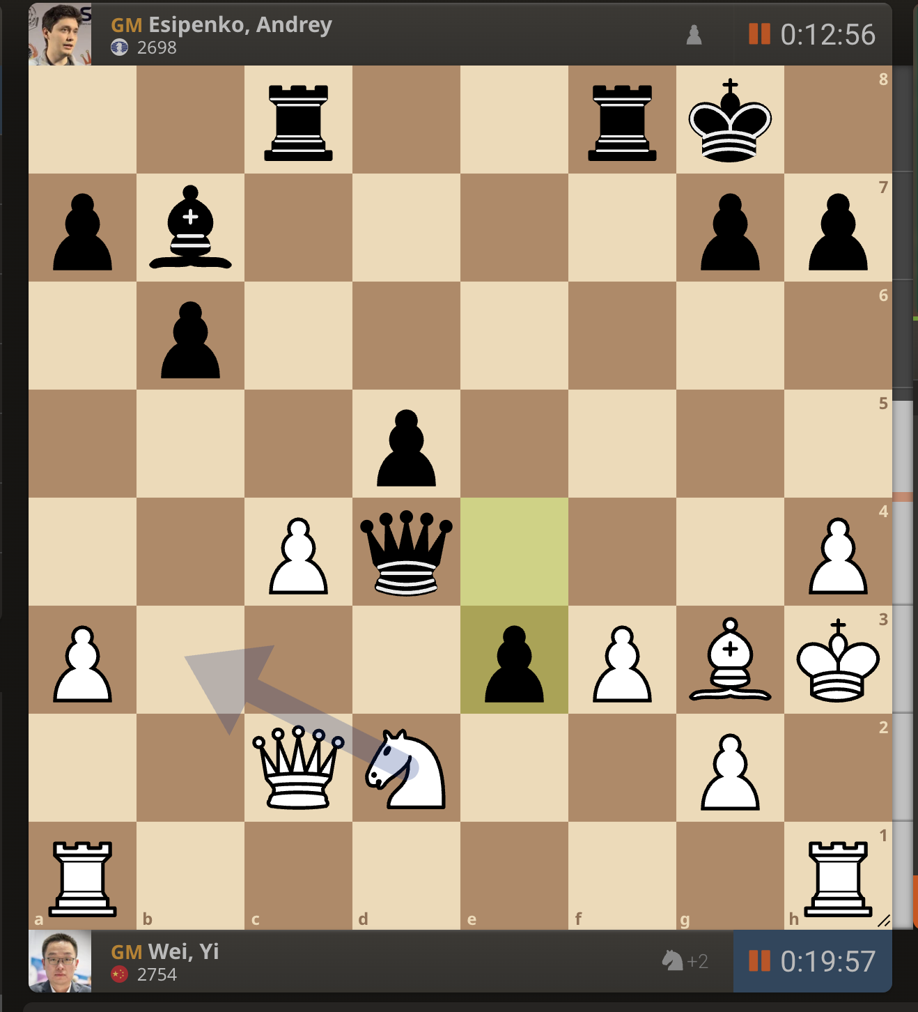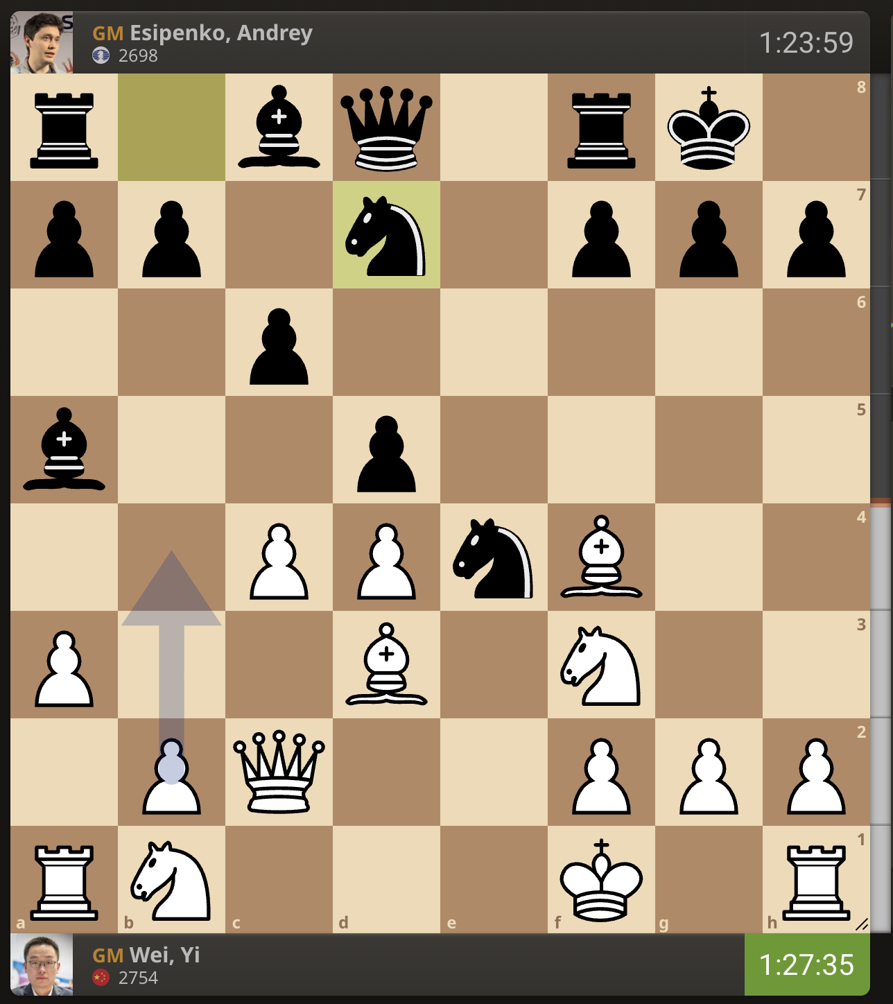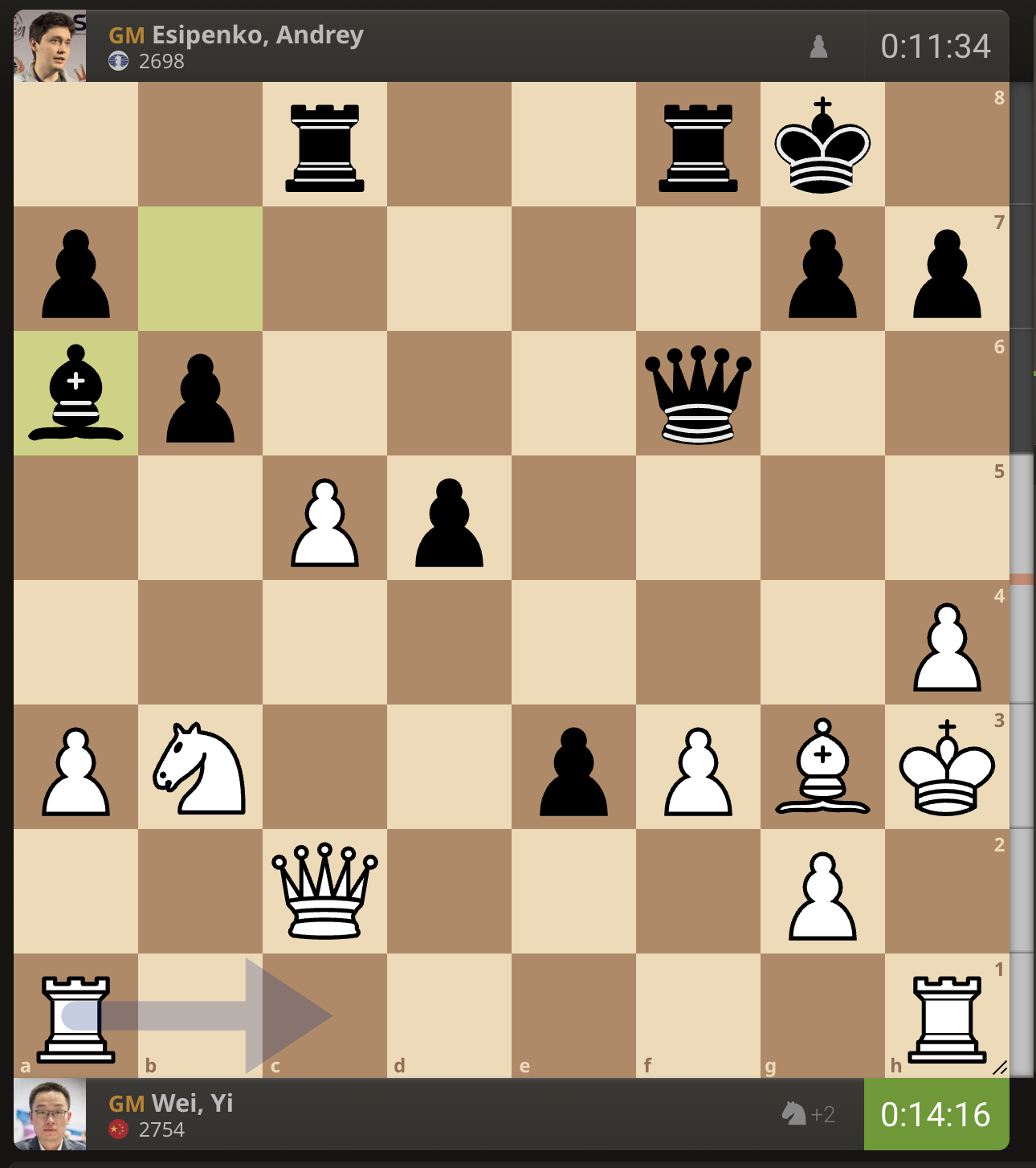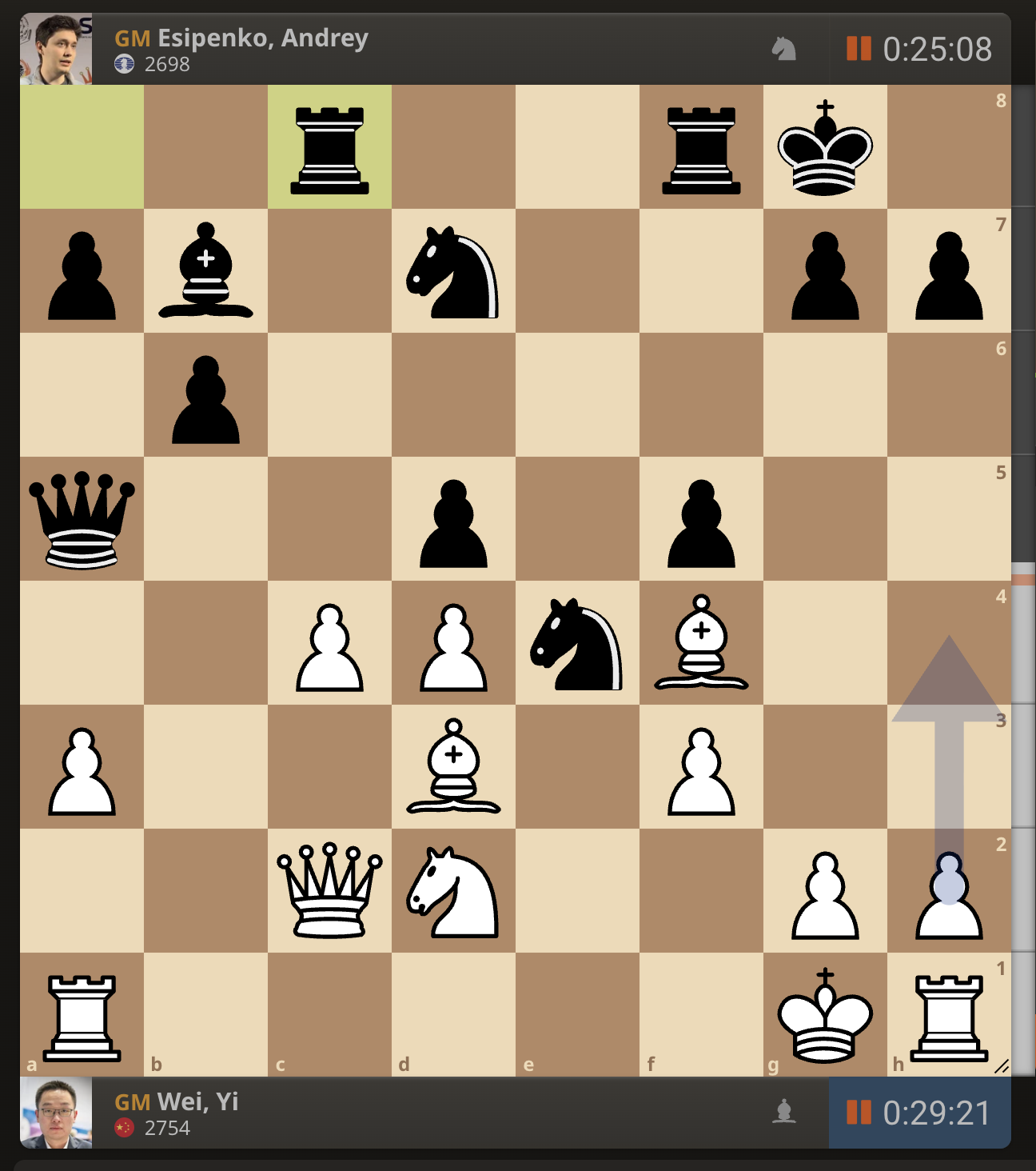 После невероятно долгого 22-минутного размышления Вэй И пошел ладьей на с3. У него осталось восемь минут, в то время как у Есипенко — 30.
