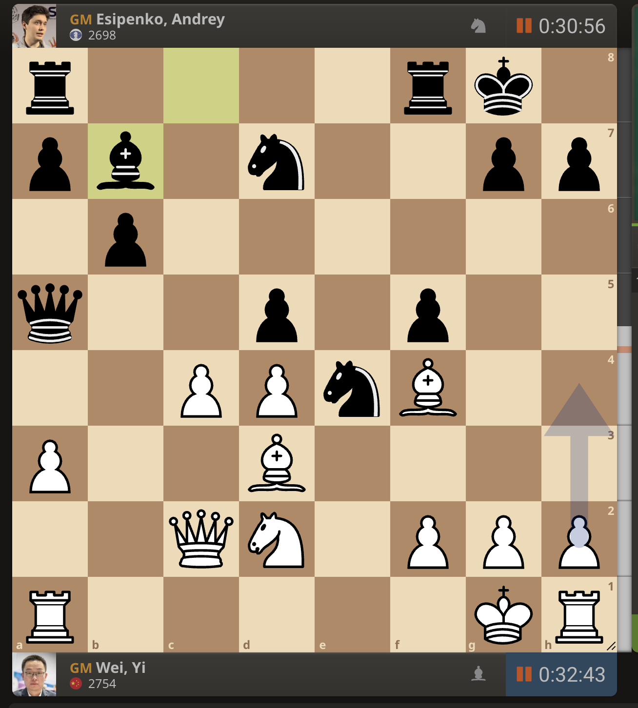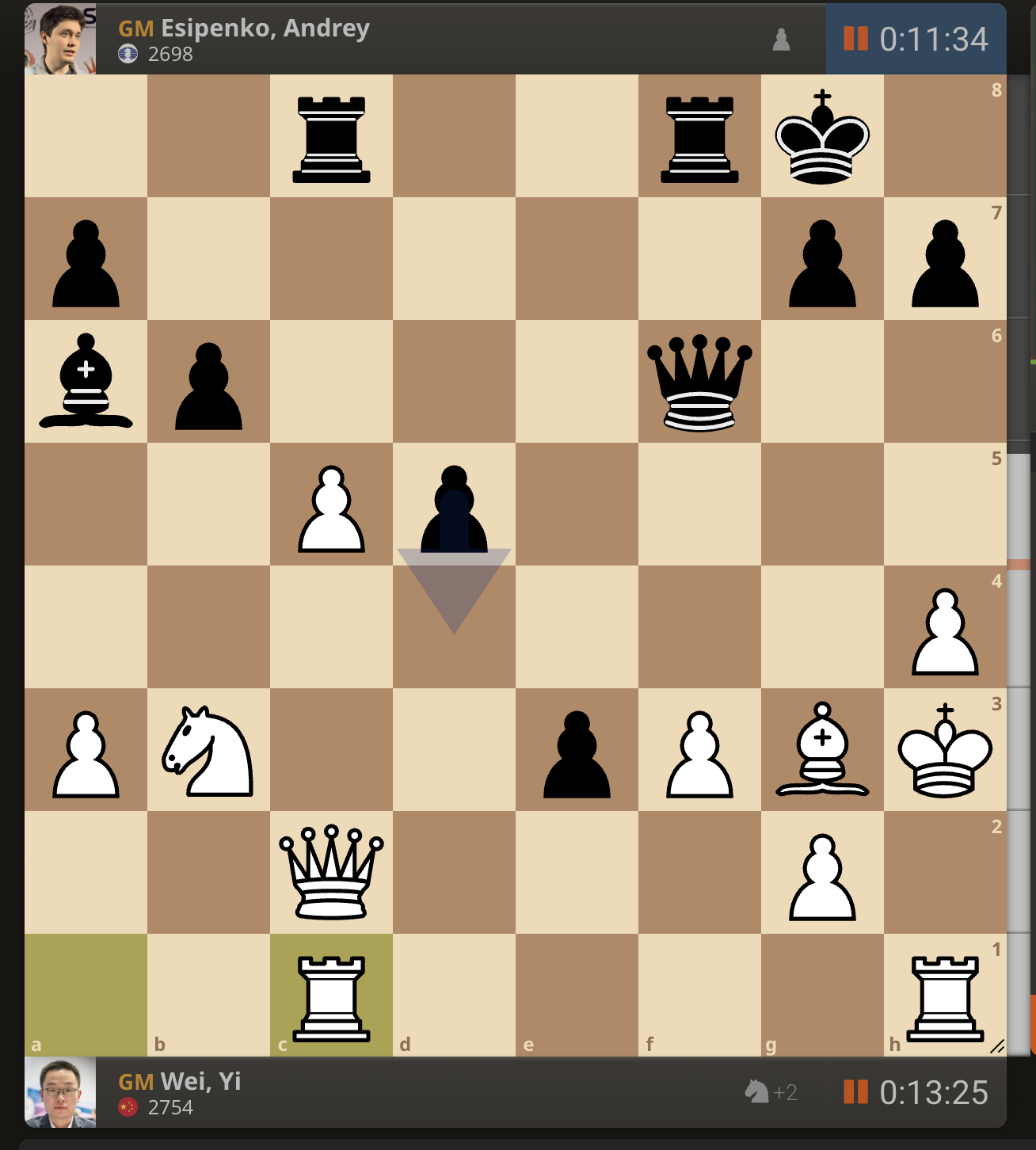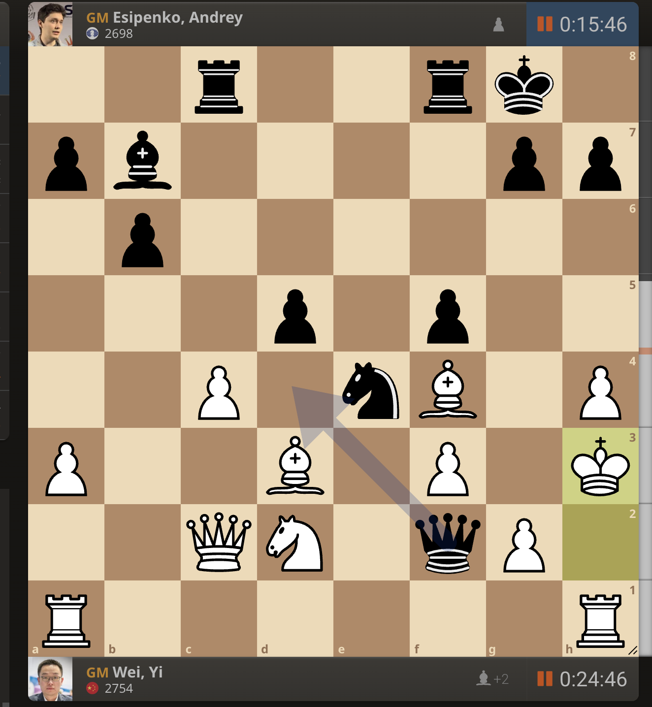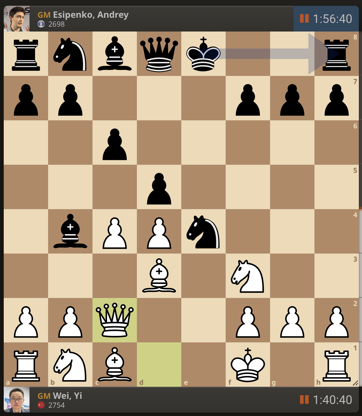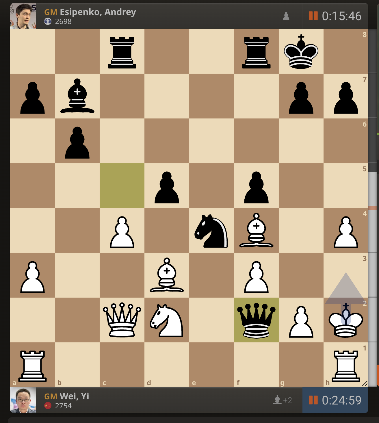 После невероятно долгого 22-минутного размышления Вэй И пошел ладьей на с3. У него осталось восемь минут, в то время как у Есипенко — 30.
