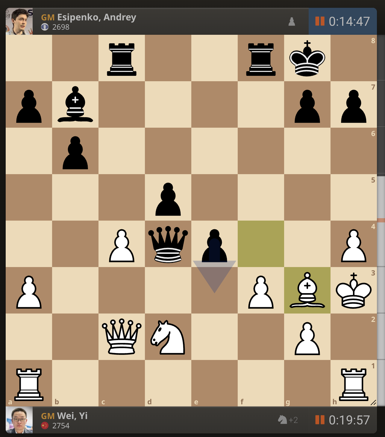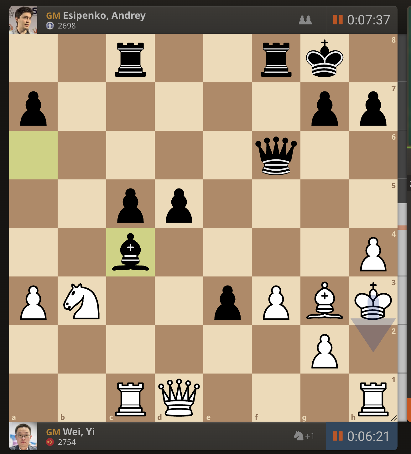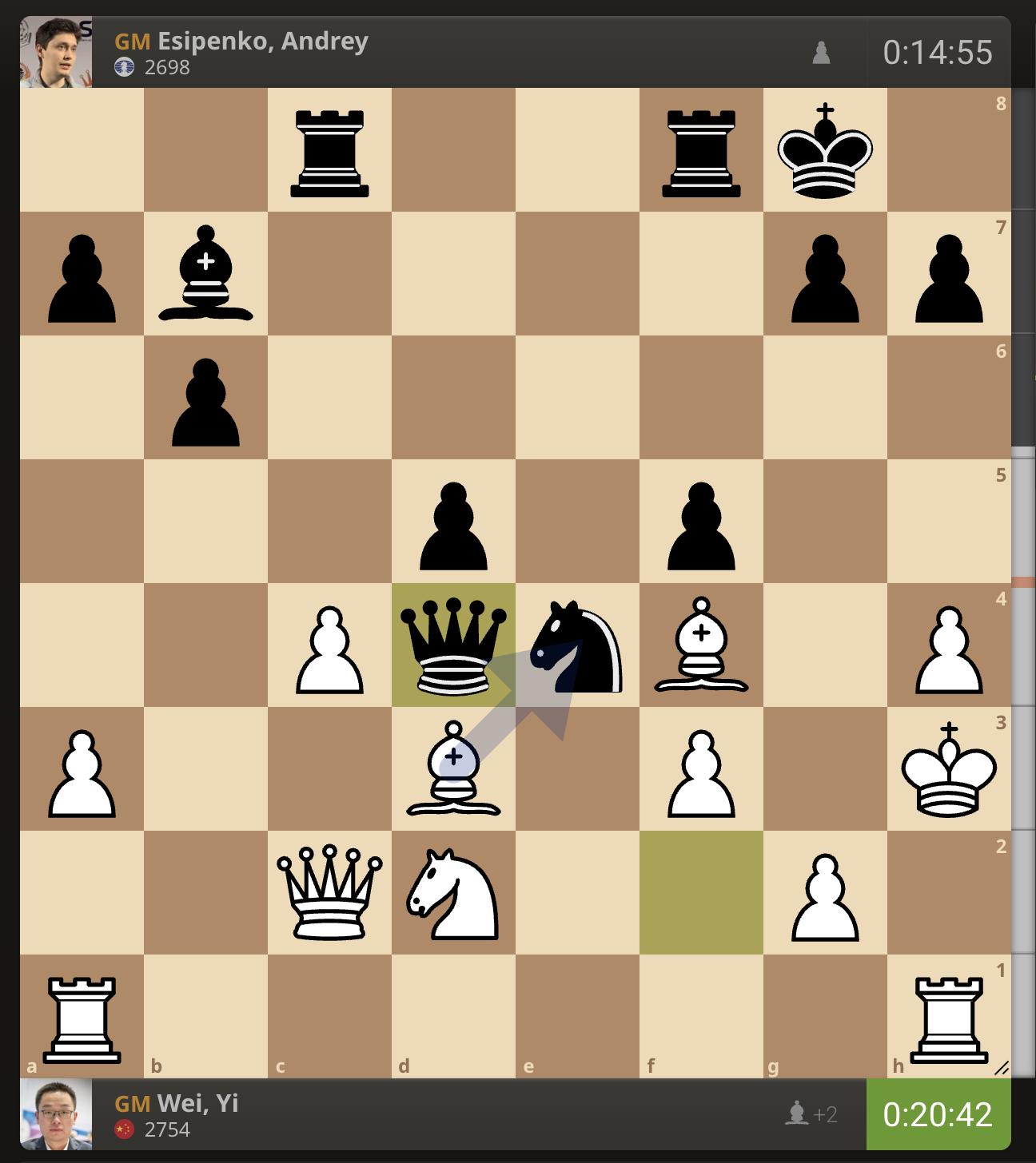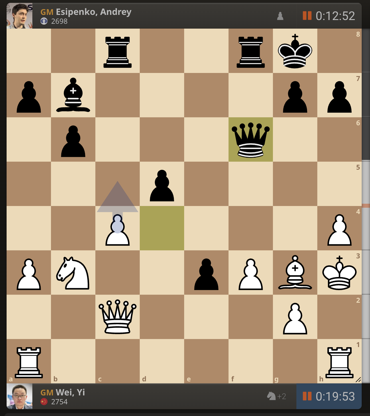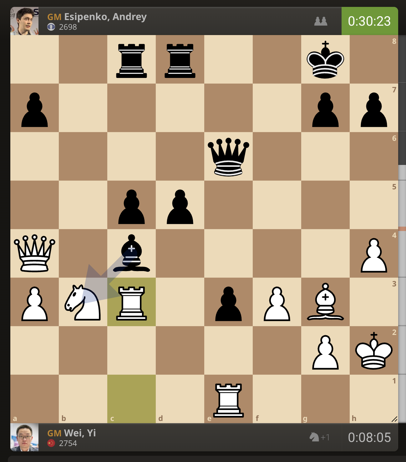 После невероятно долгого 22-минутного размышления Вэй И пошел ладьей на с3. У него осталось восемь минут, в то время как у Есипенко — 30.