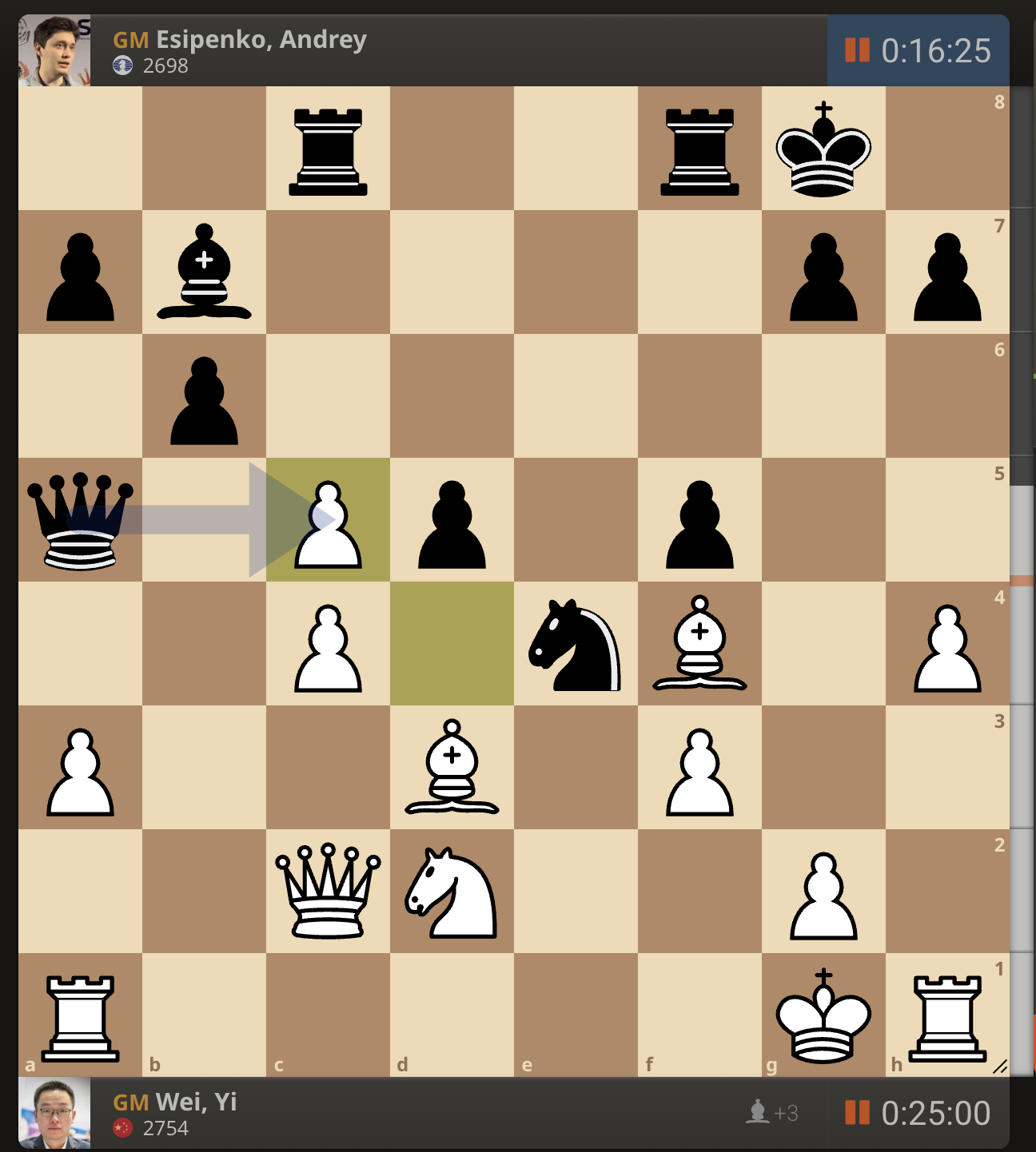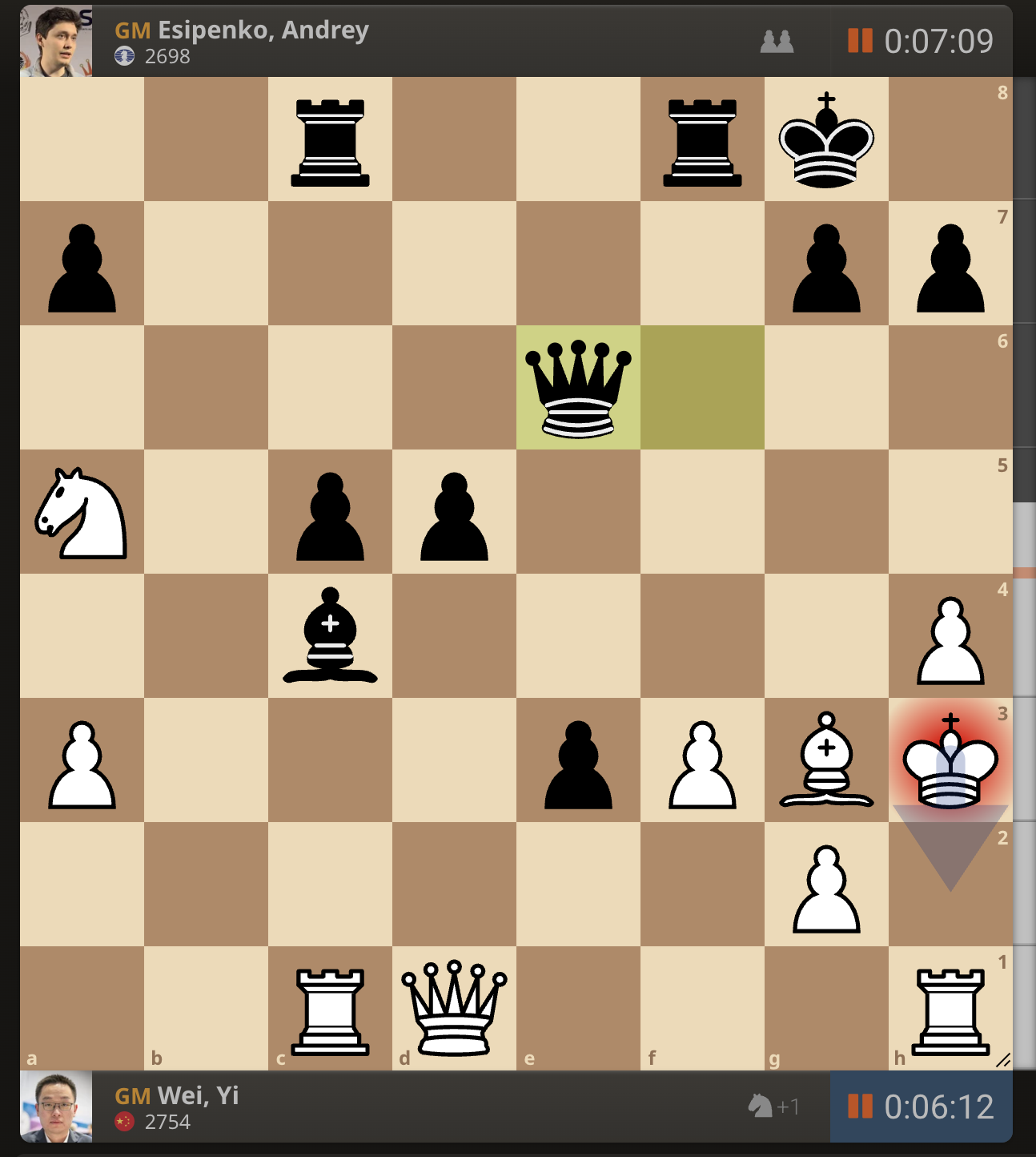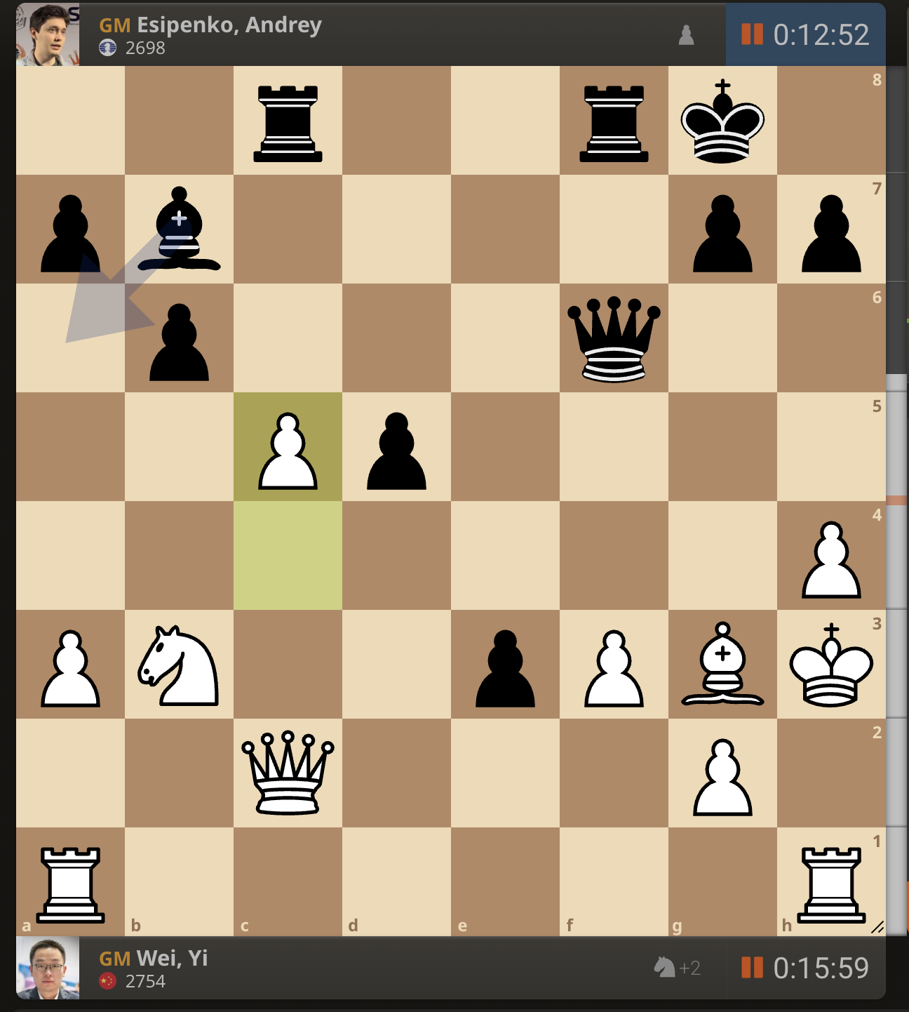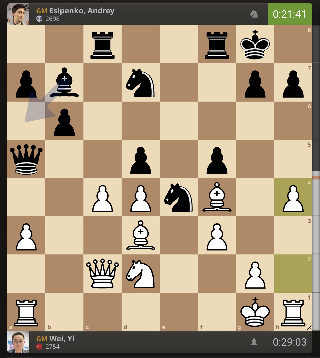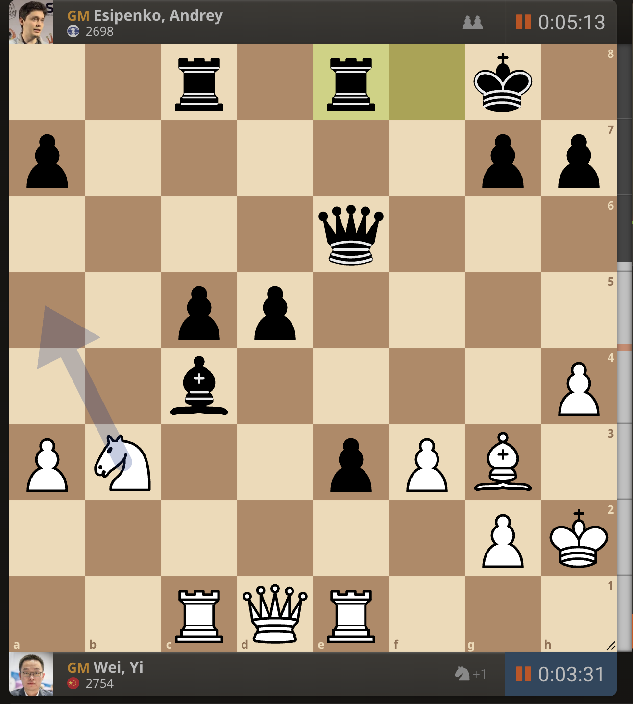 После невероятно долгого 22-минутного размышления Вэй И пошел ладьей на с3. У него осталось восемь минут, в то время как у Есипенко — 30.