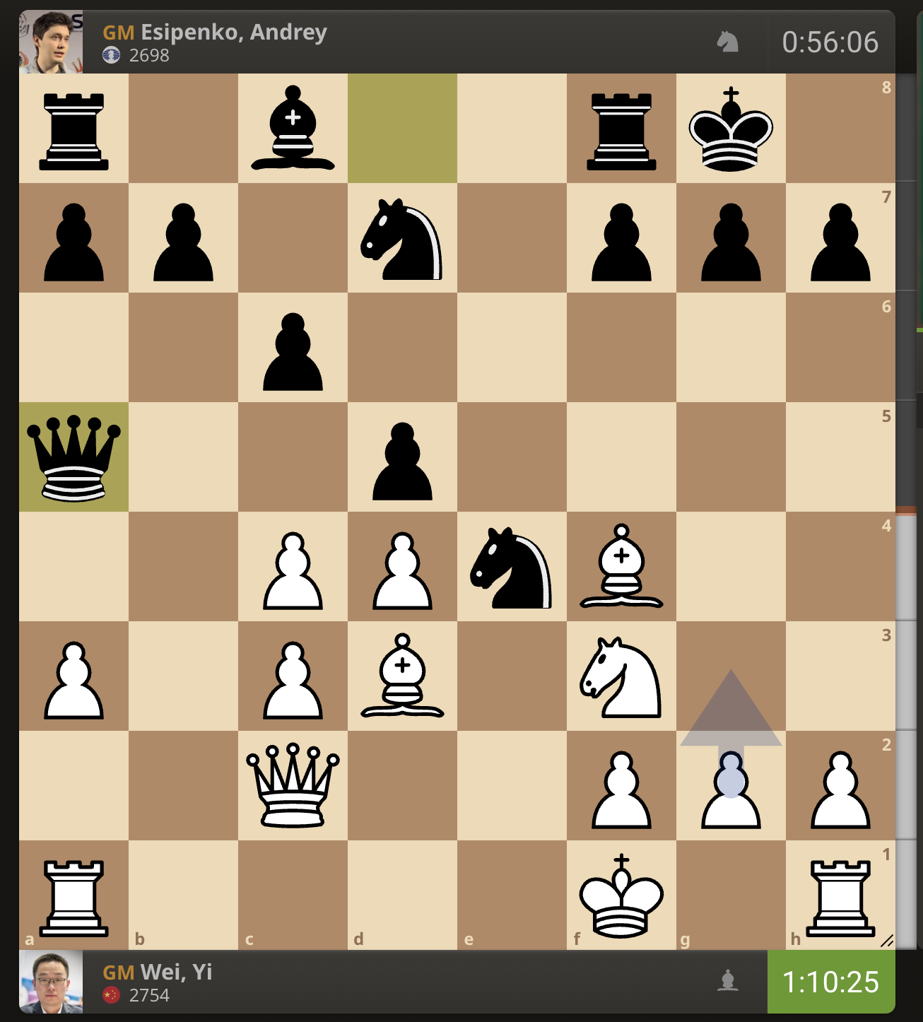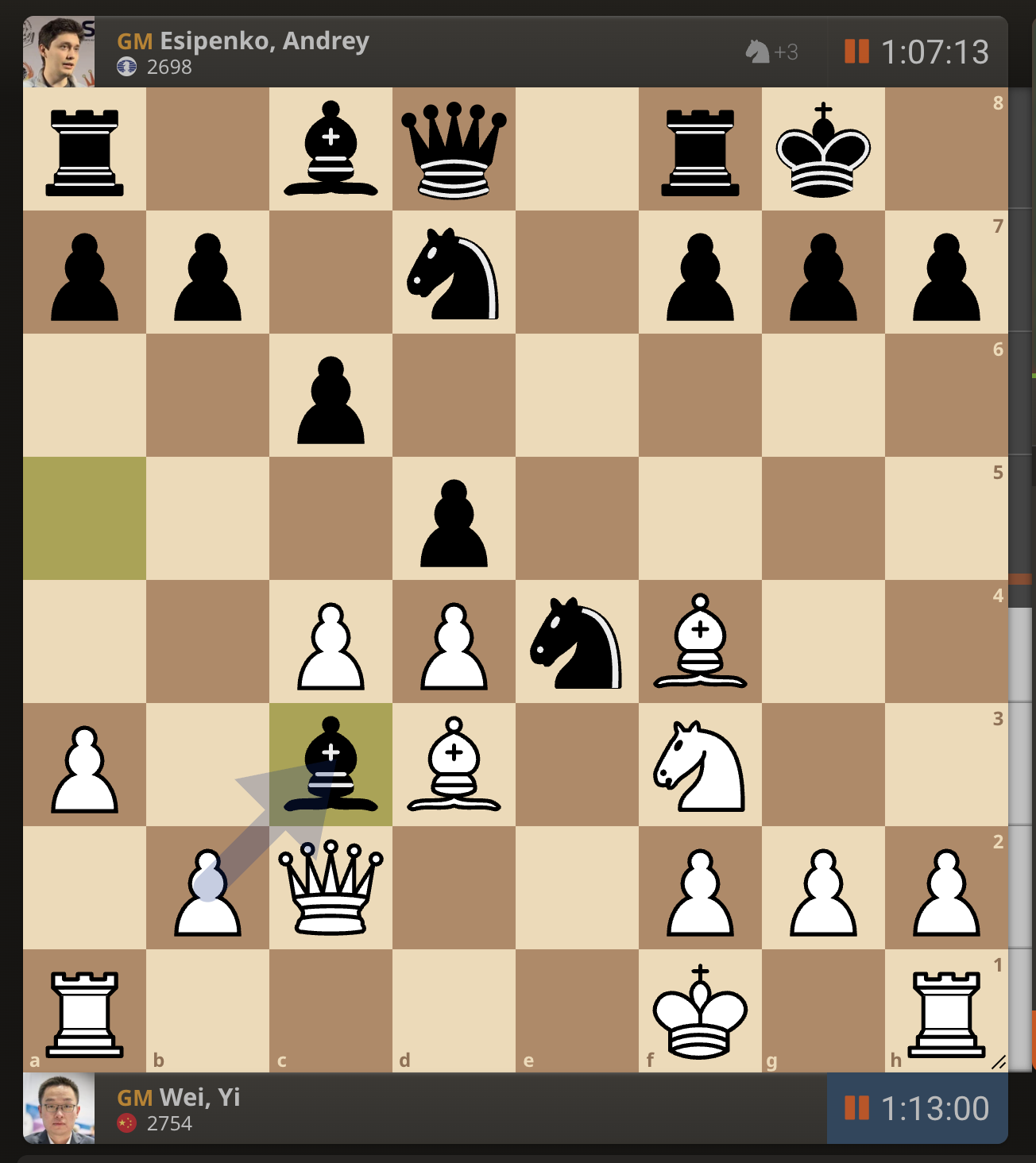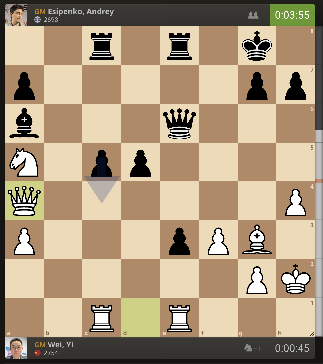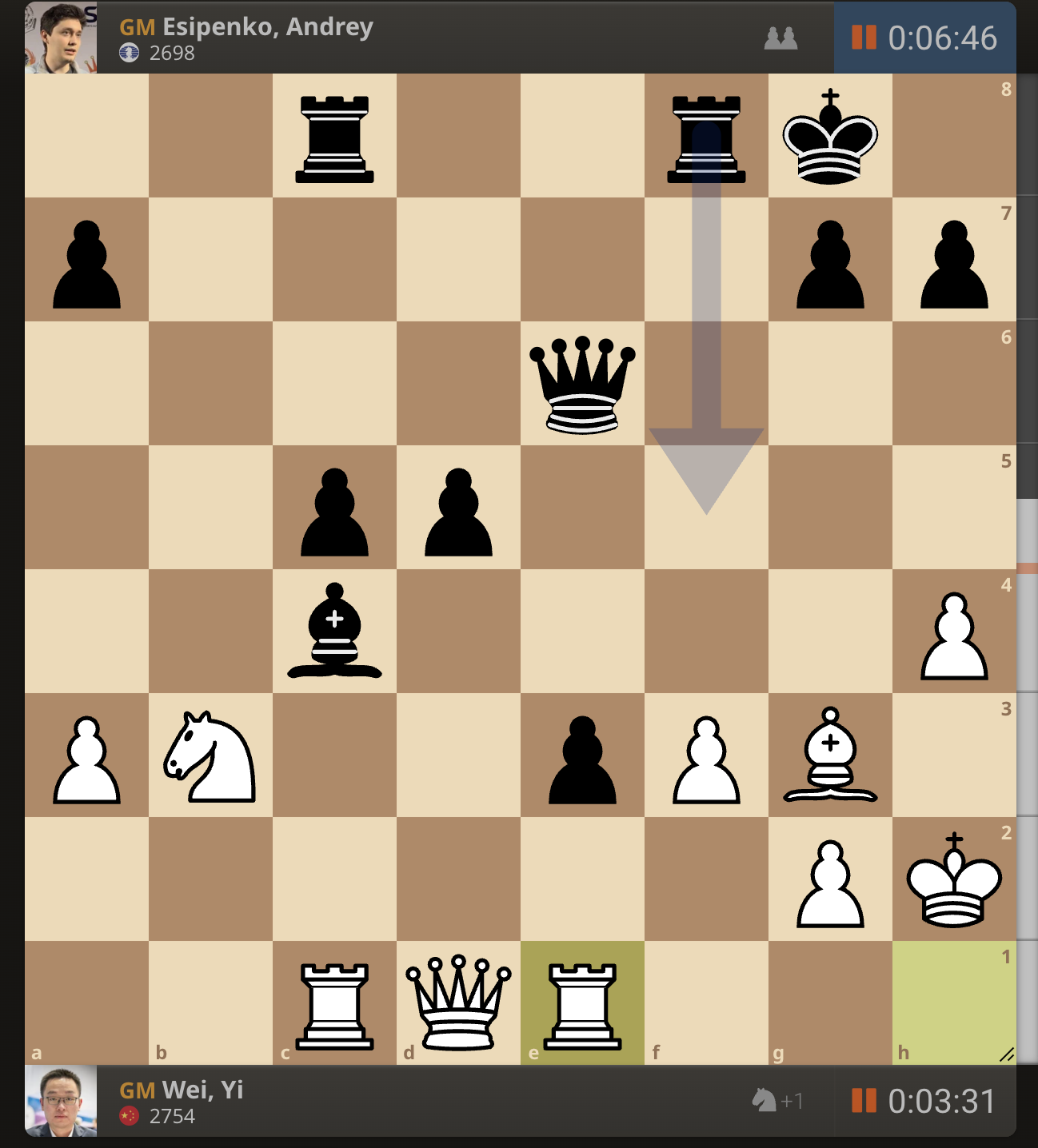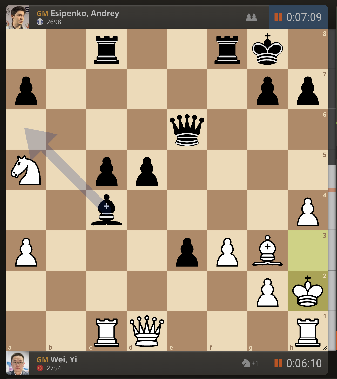 После невероятно долгого 22-минутного размышления Вэй И пошел ладьей на с3. У него осталось восемь минут, в то время как у Есипенко — 30.