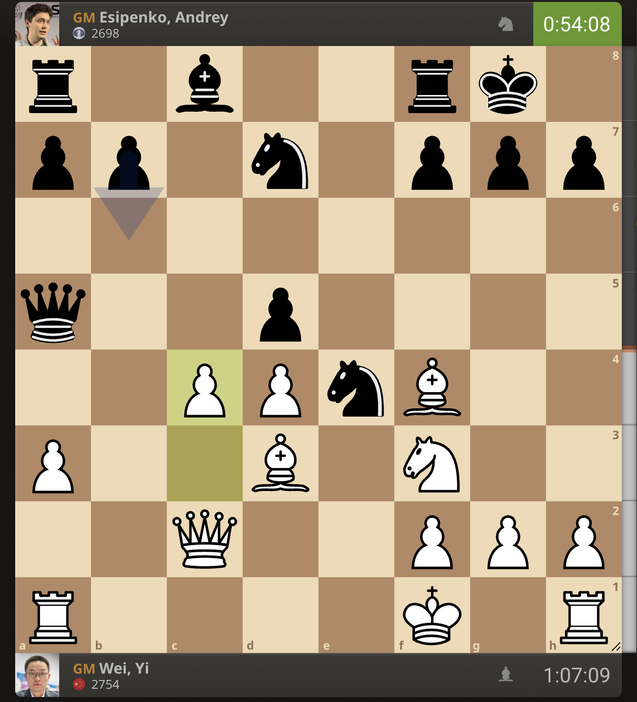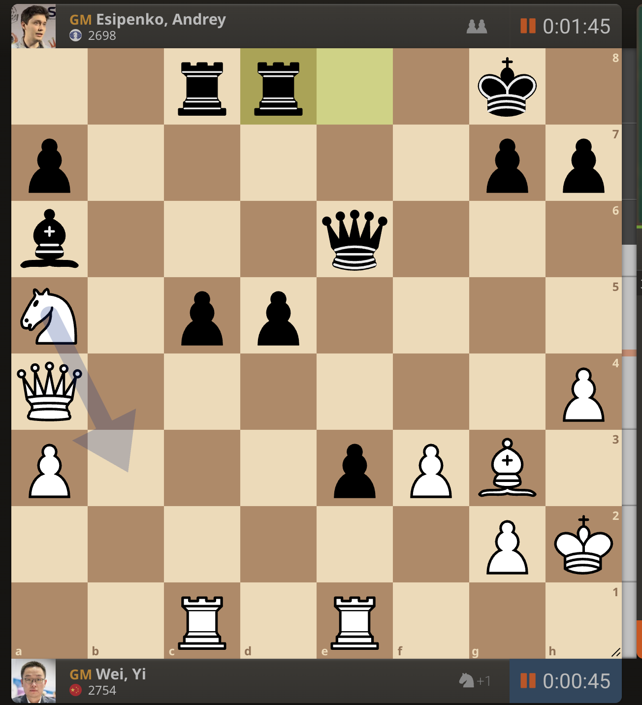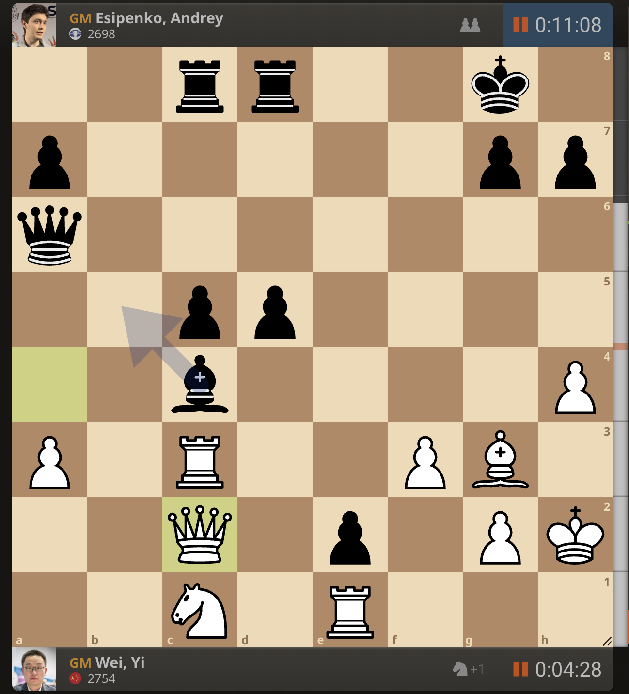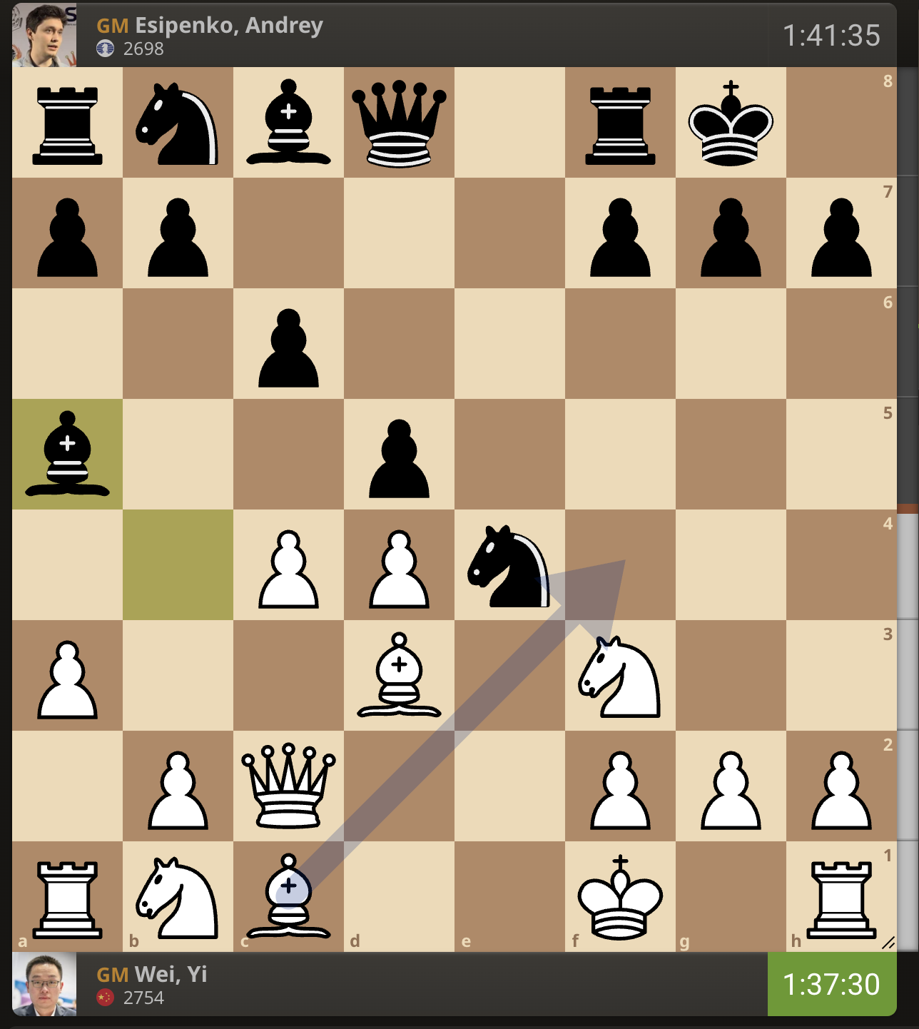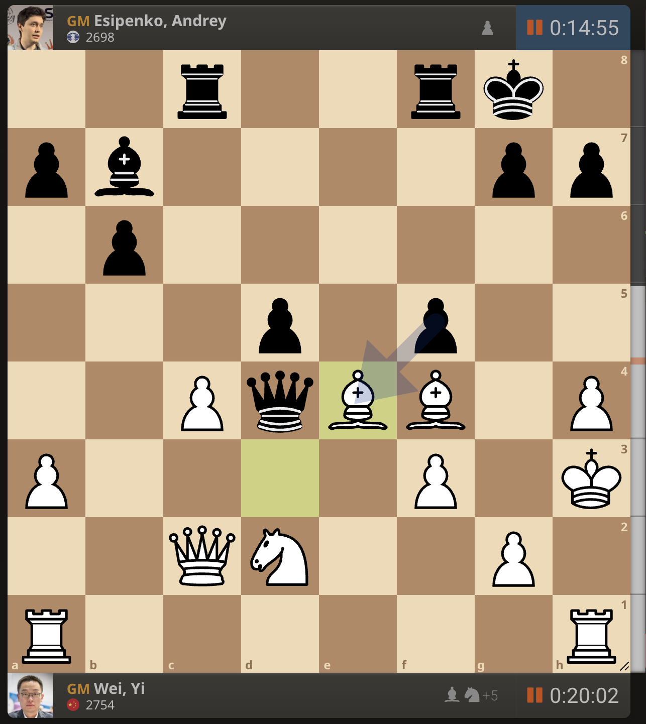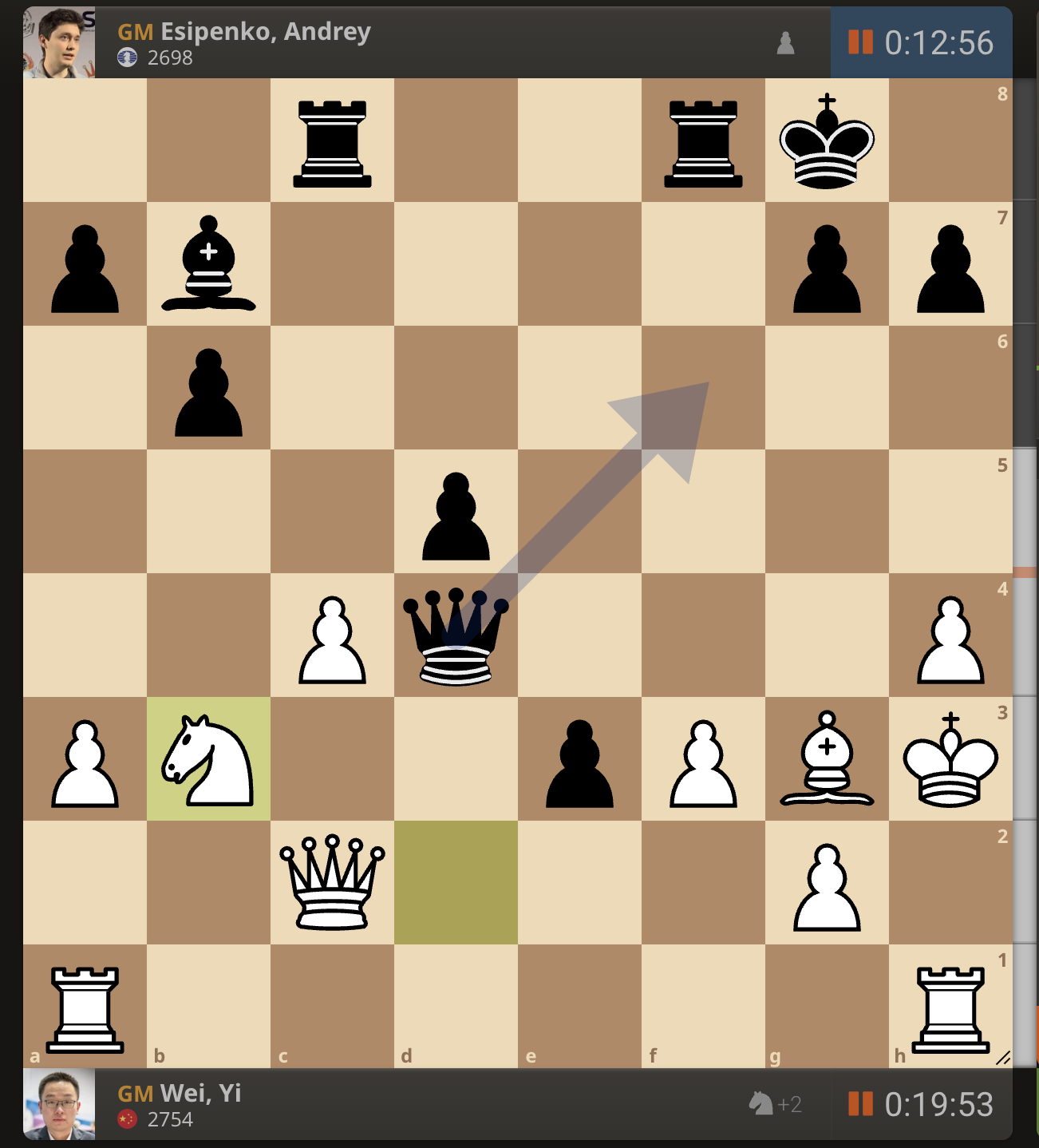 После невероятно долгого 22-минутного размышления Вэй И пошел ладьей на с3. У него осталось восемь минут, в то время как у Есипенко — 30.