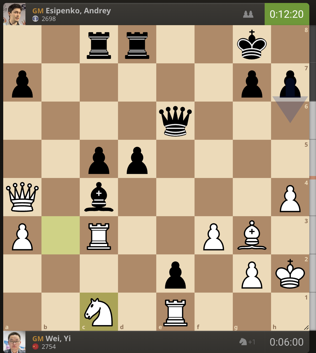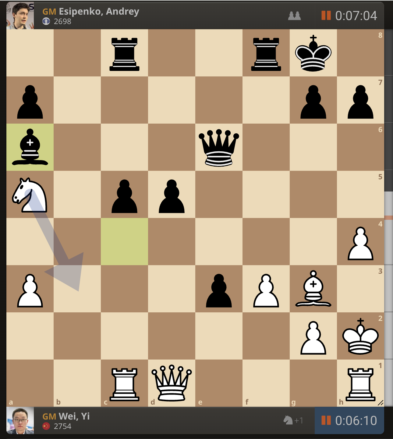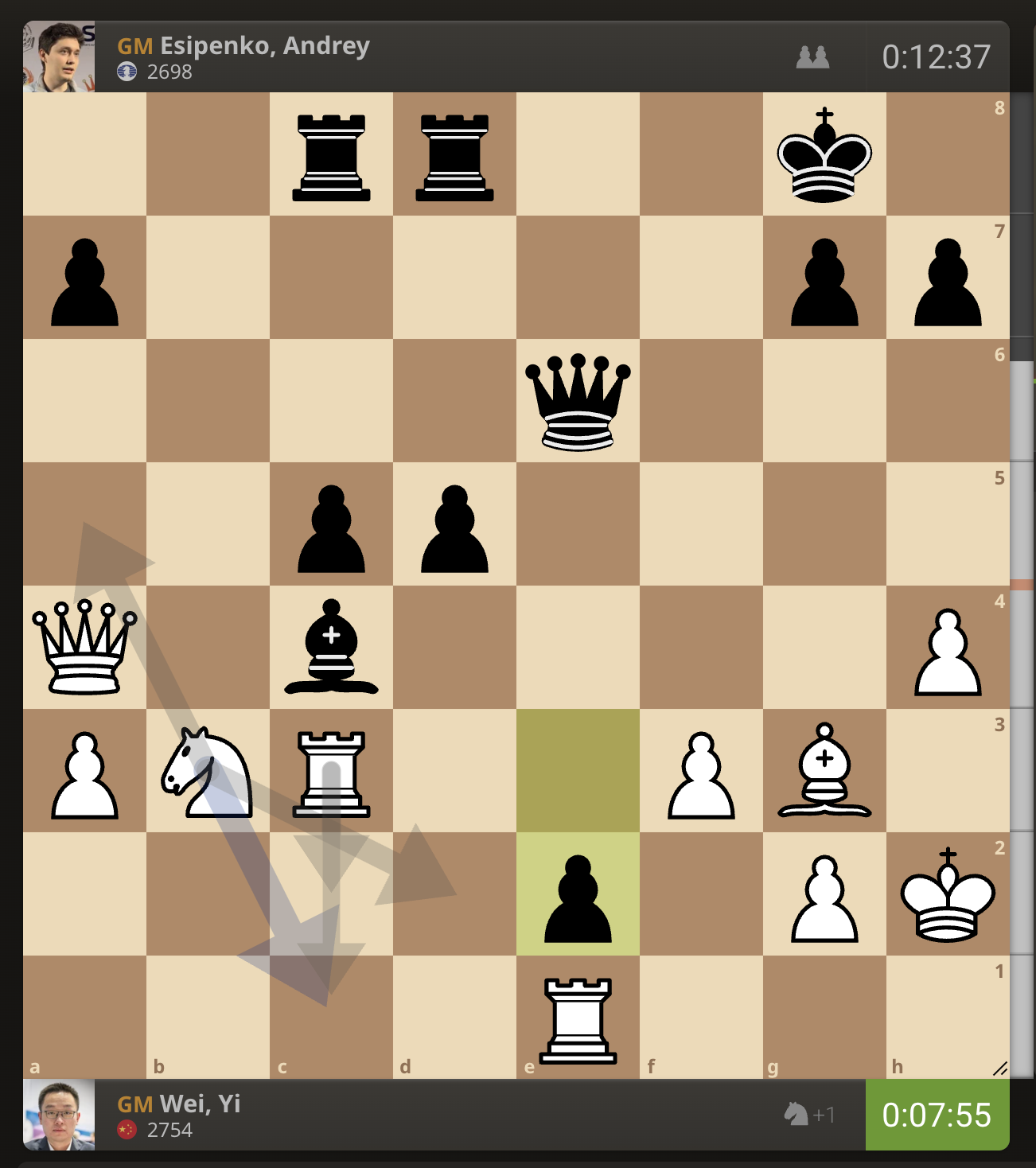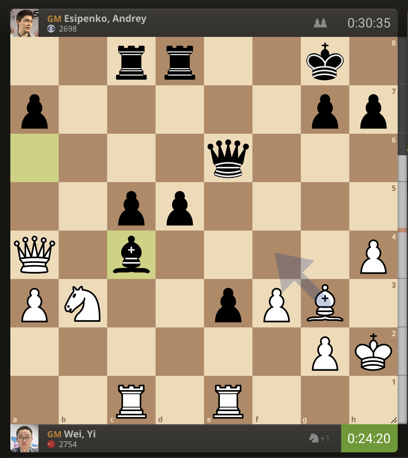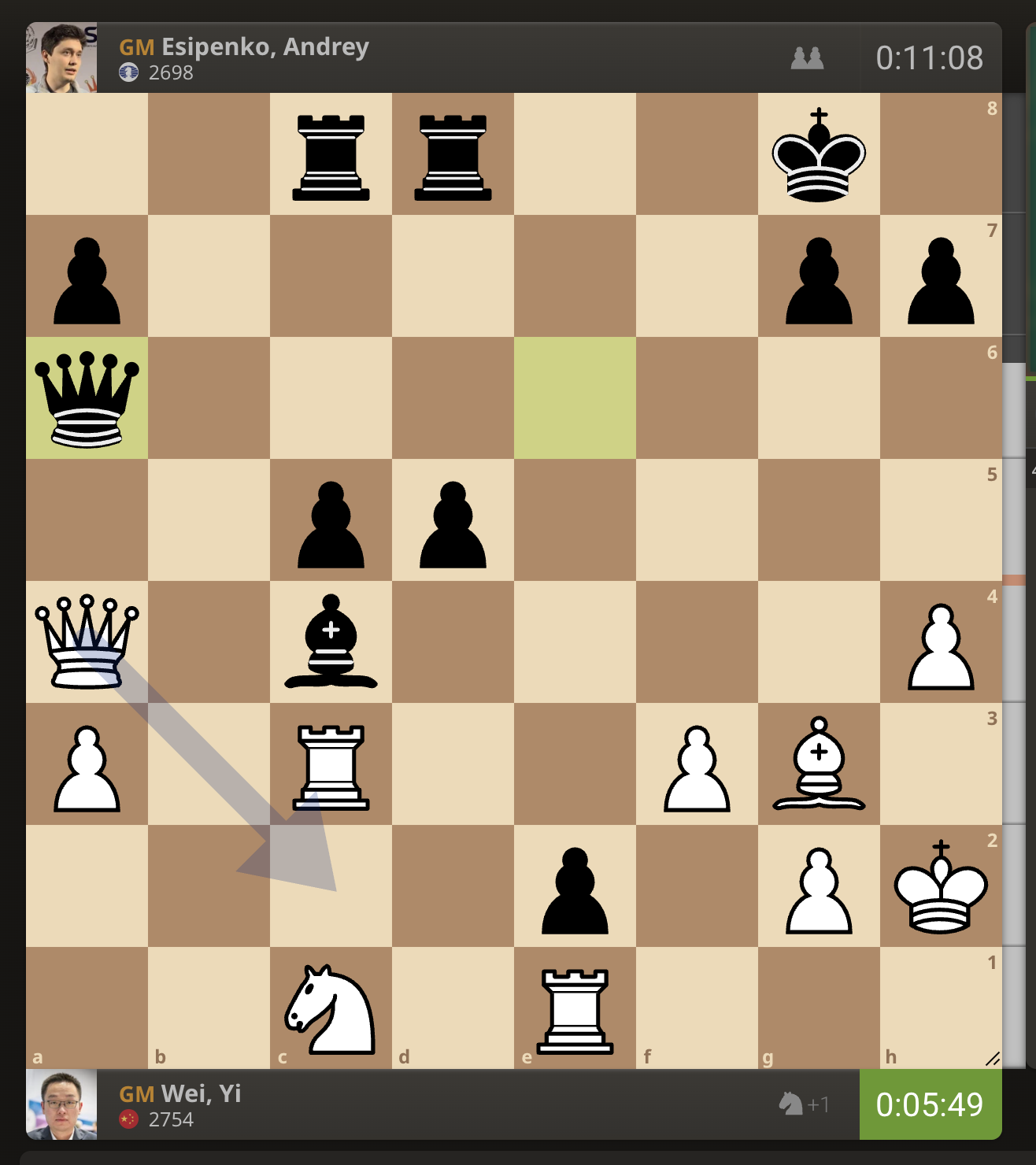 После невероятно долгого 22-минутного размышления Вэй И пошел ладьей на с3. У него осталось восемь минут, в то время как у Есипенко — 30.