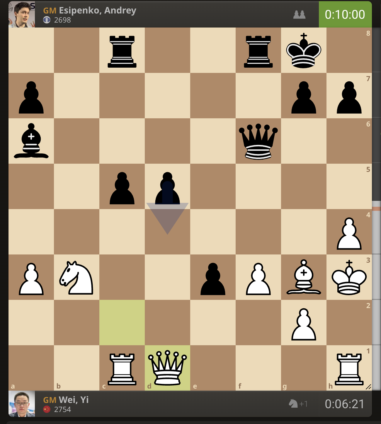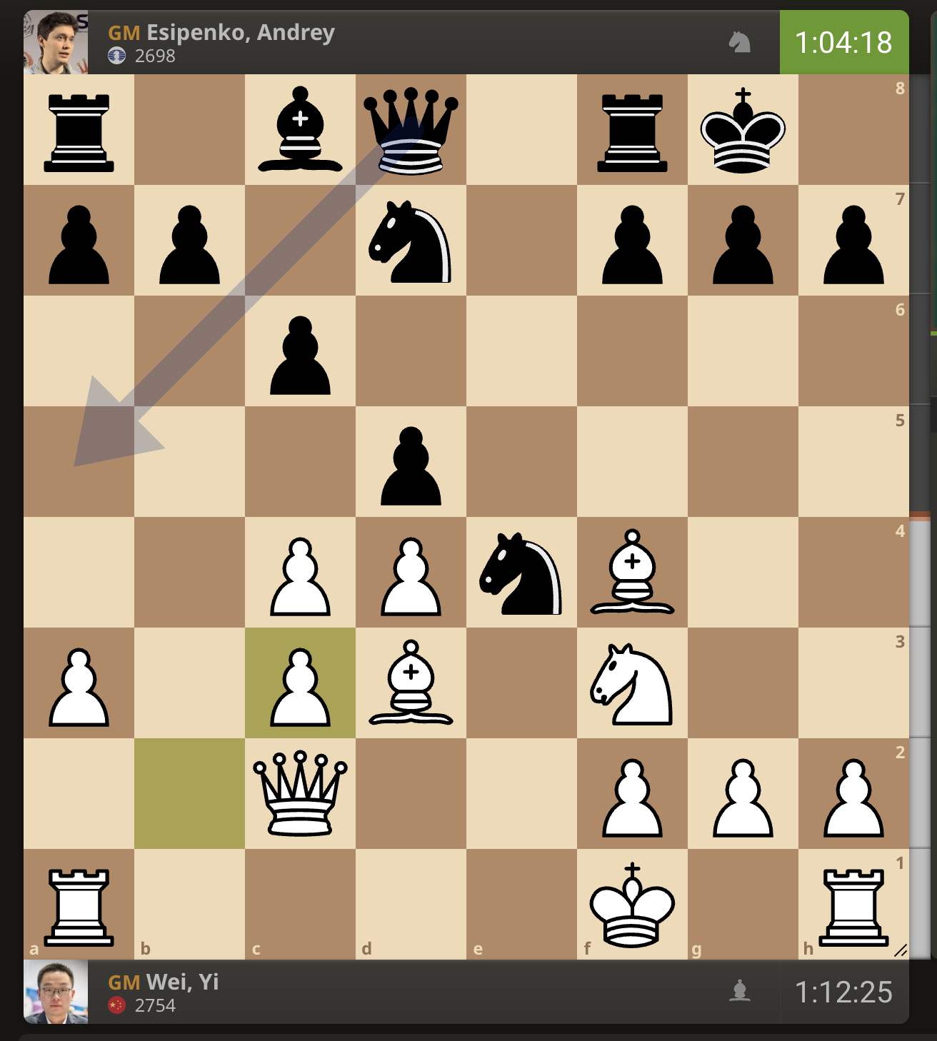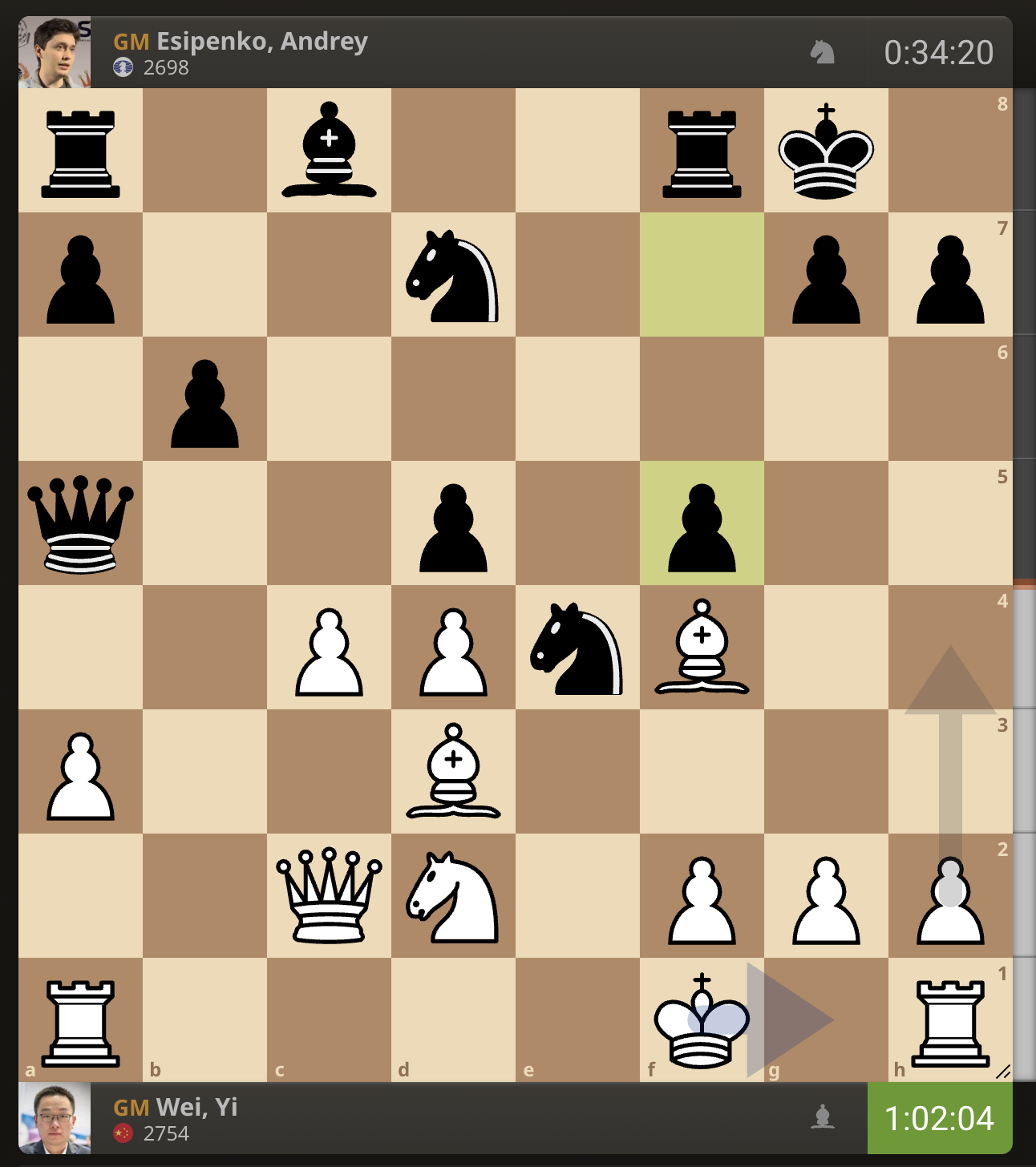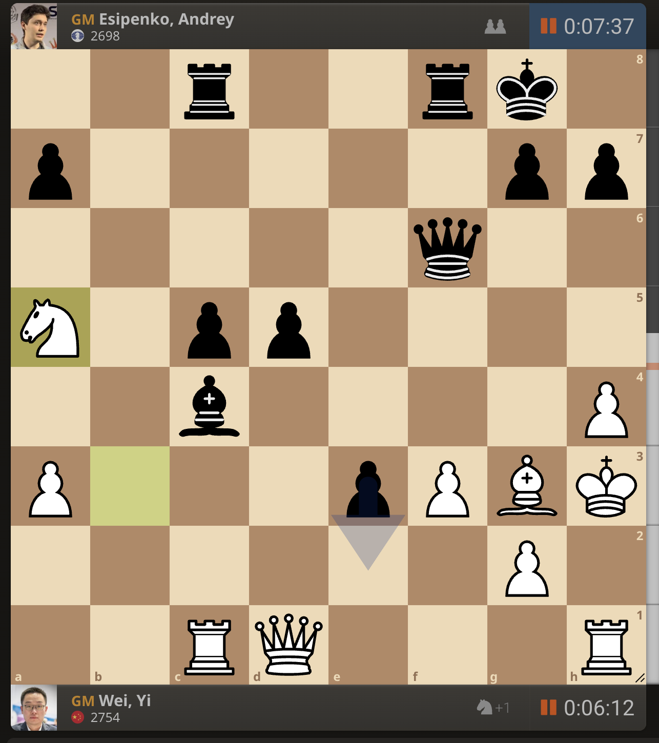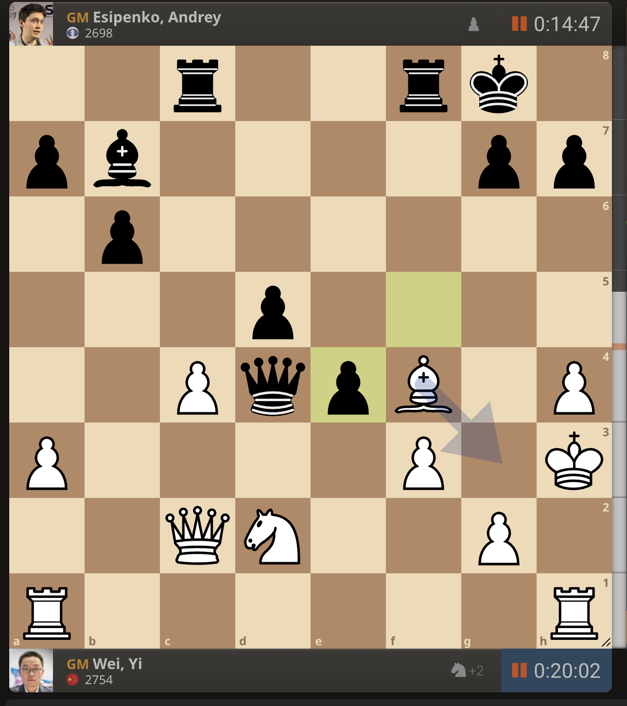 После невероятно долгого 22-минутного размышления Вэй И пошел ладьей на с3. У него осталось восемь минут, в то время как у Есипенко — 30.