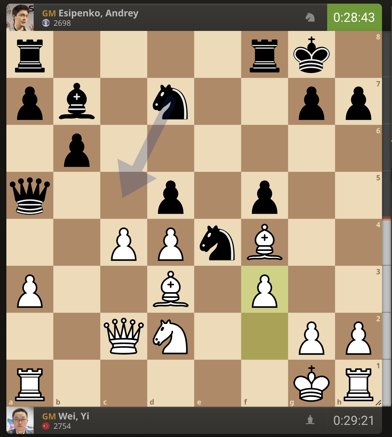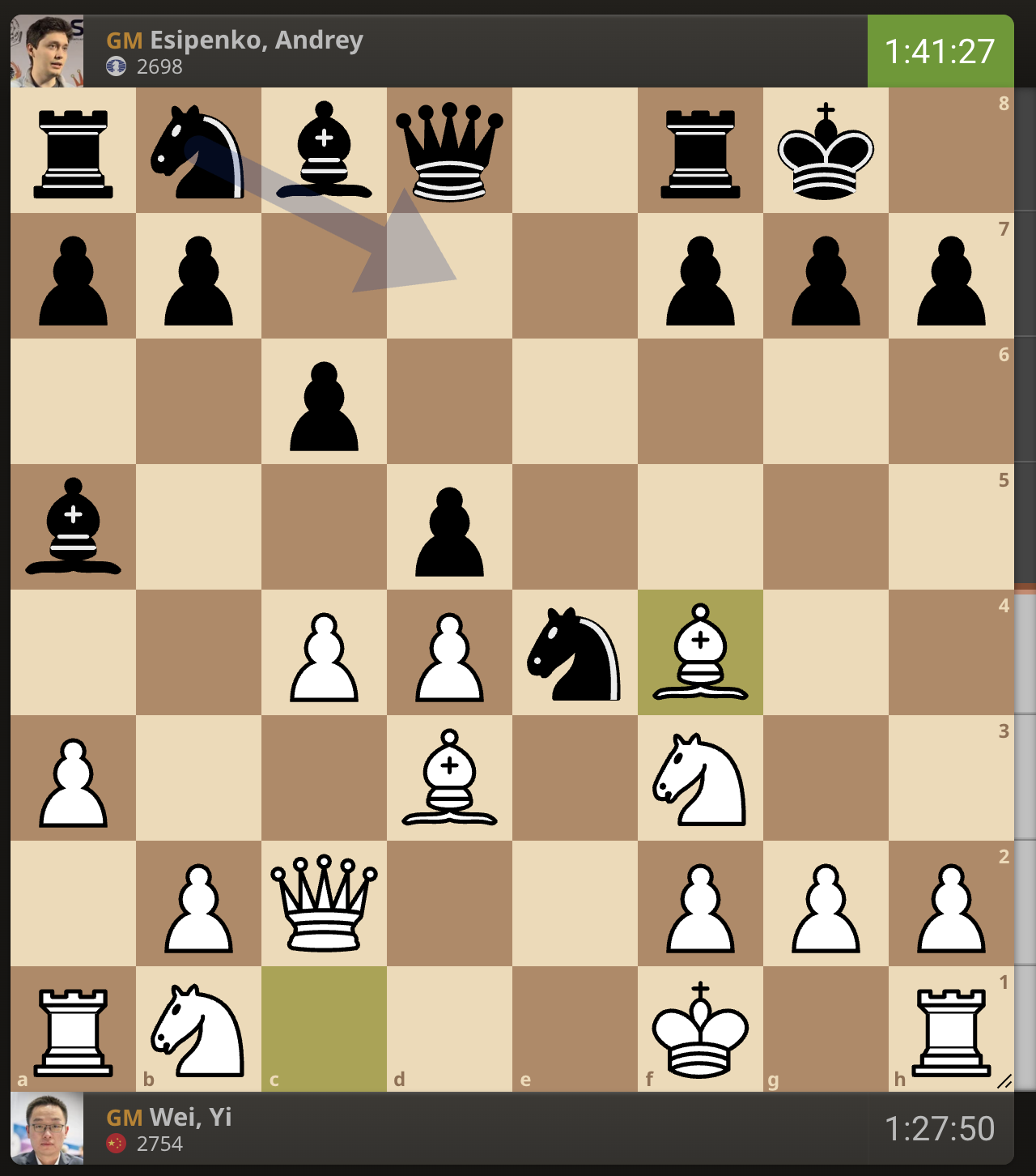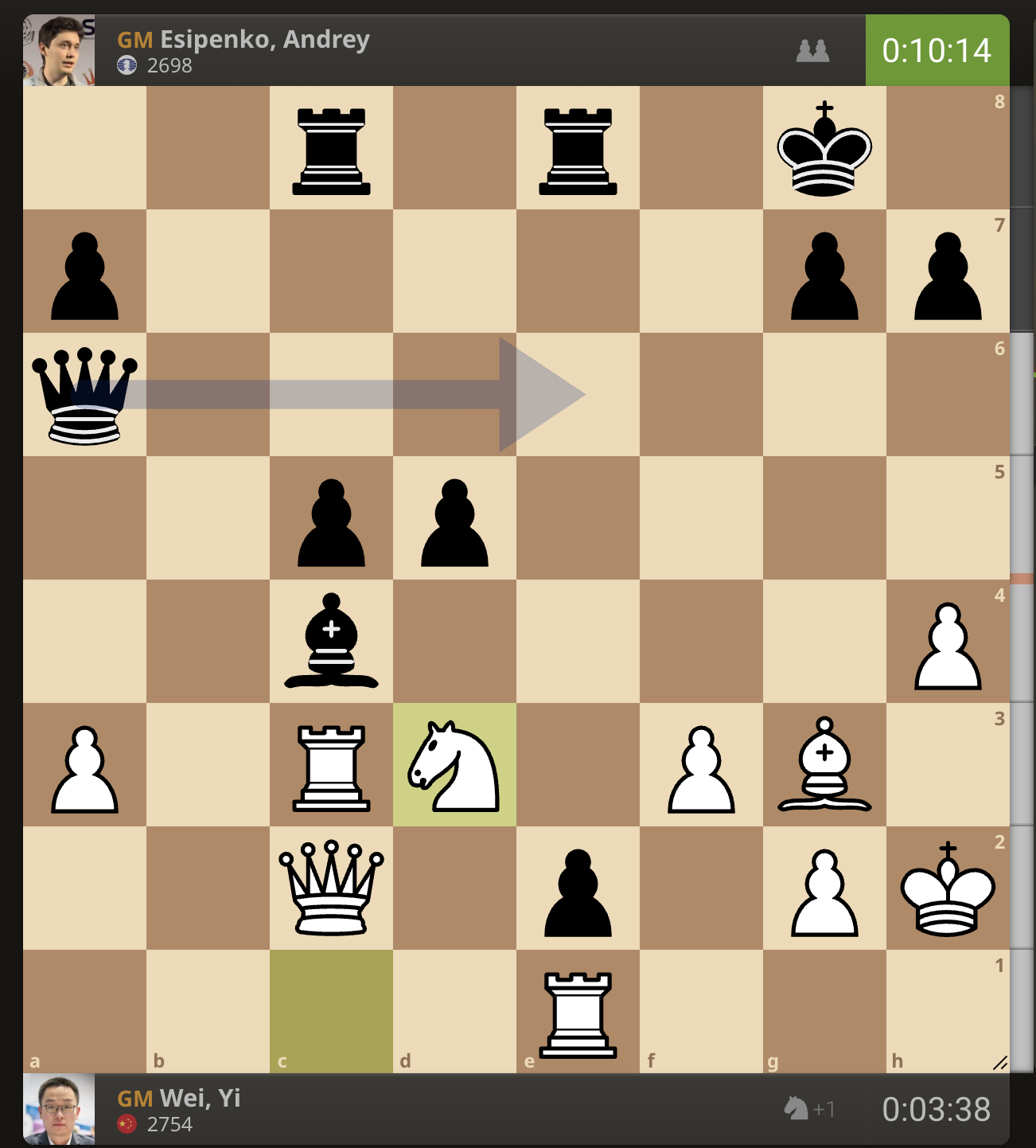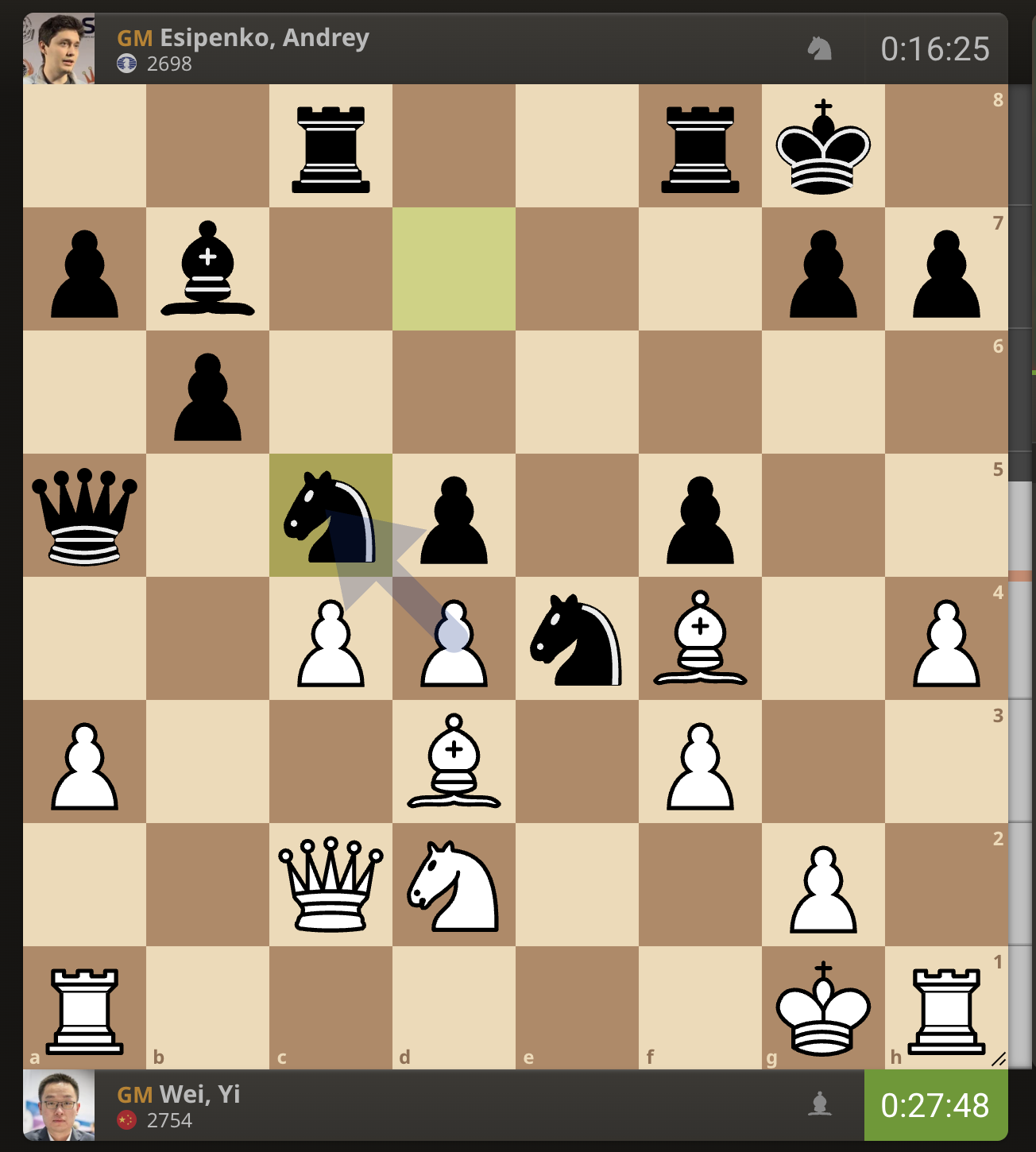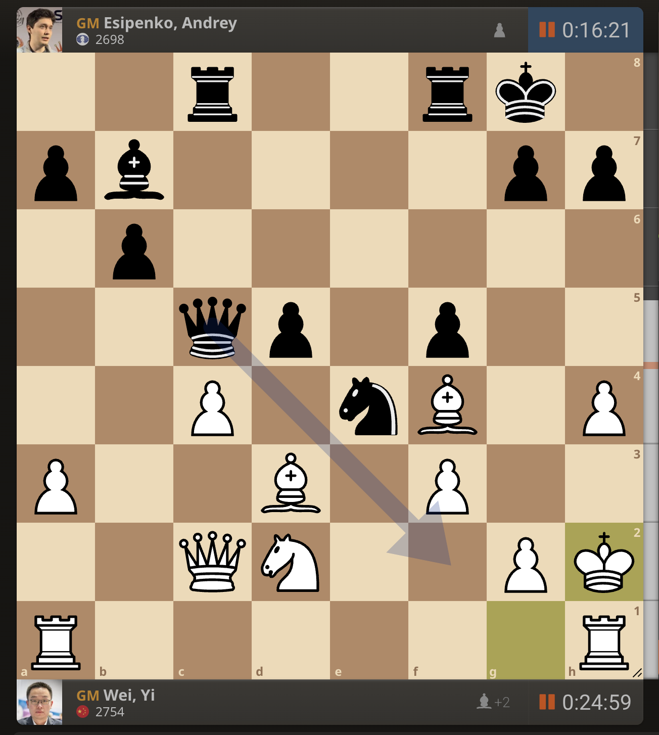 После невероятно долгого 22-минутного размышления Вэй И пошел ладьей на с3. У него осталось восемь минут, в то время как у Есипенко — 30.