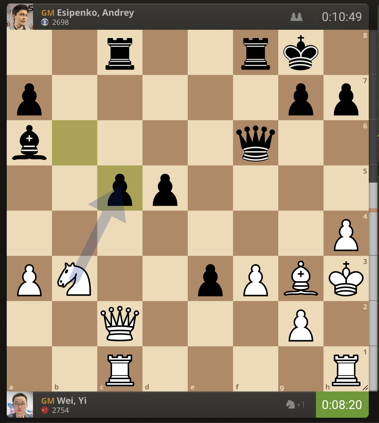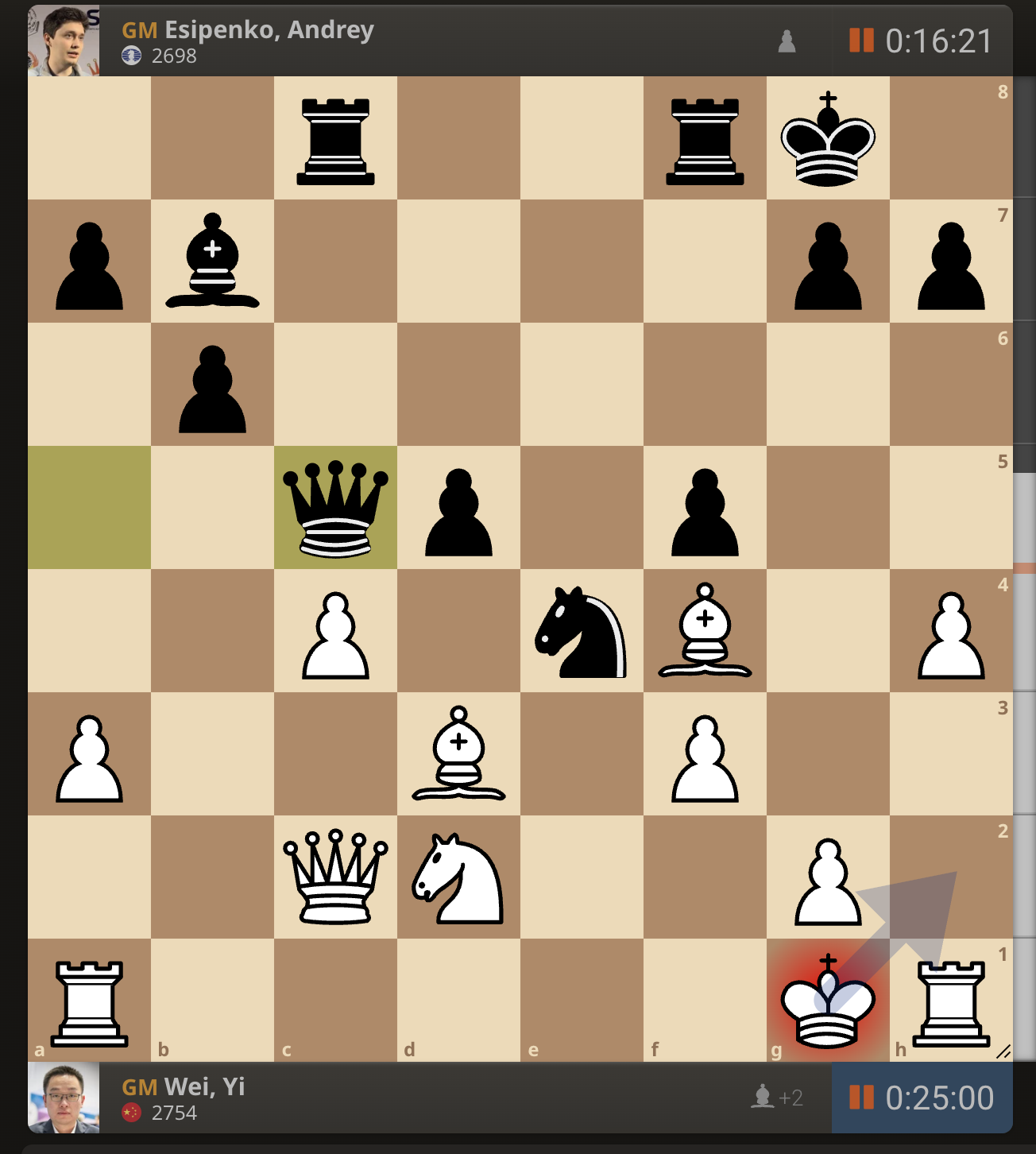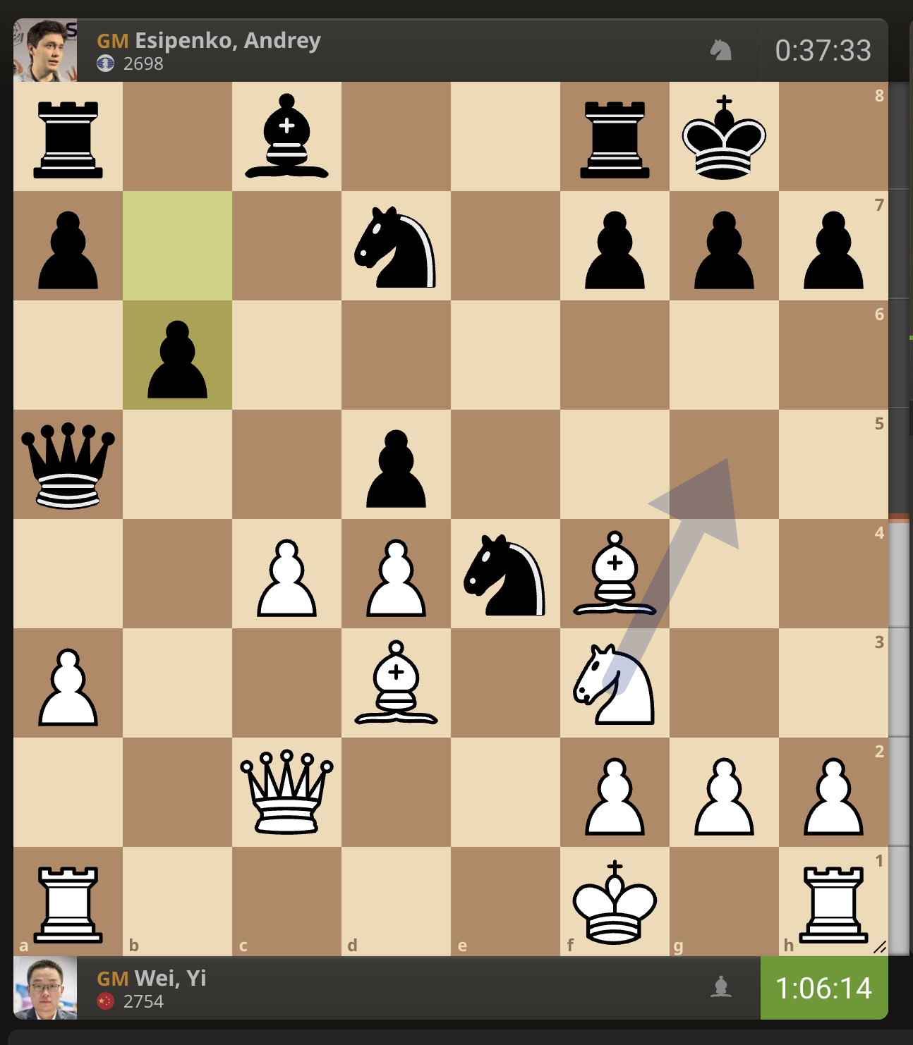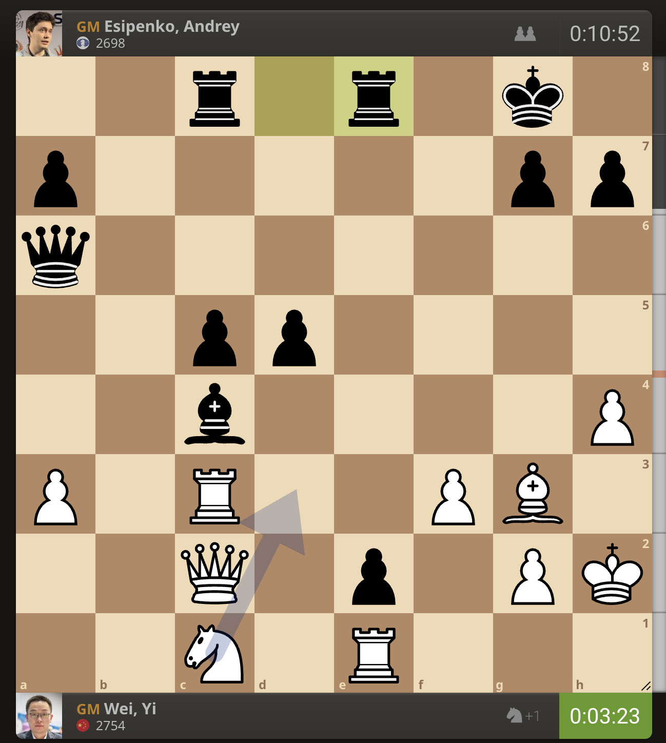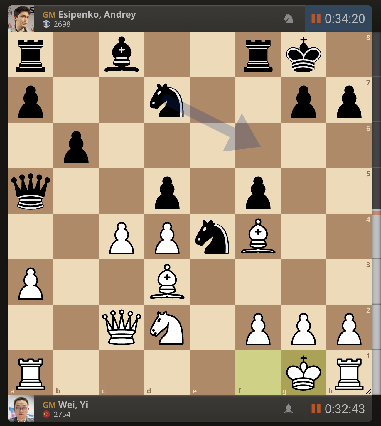 После невероятно долгого 22-минутного размышления Вэй И пошел ладьей на с3. У него осталось восемь минут, в то время как у Есипенко — 30.