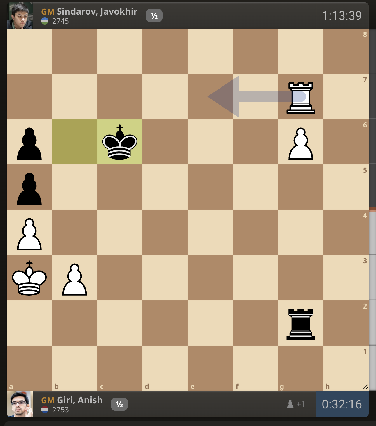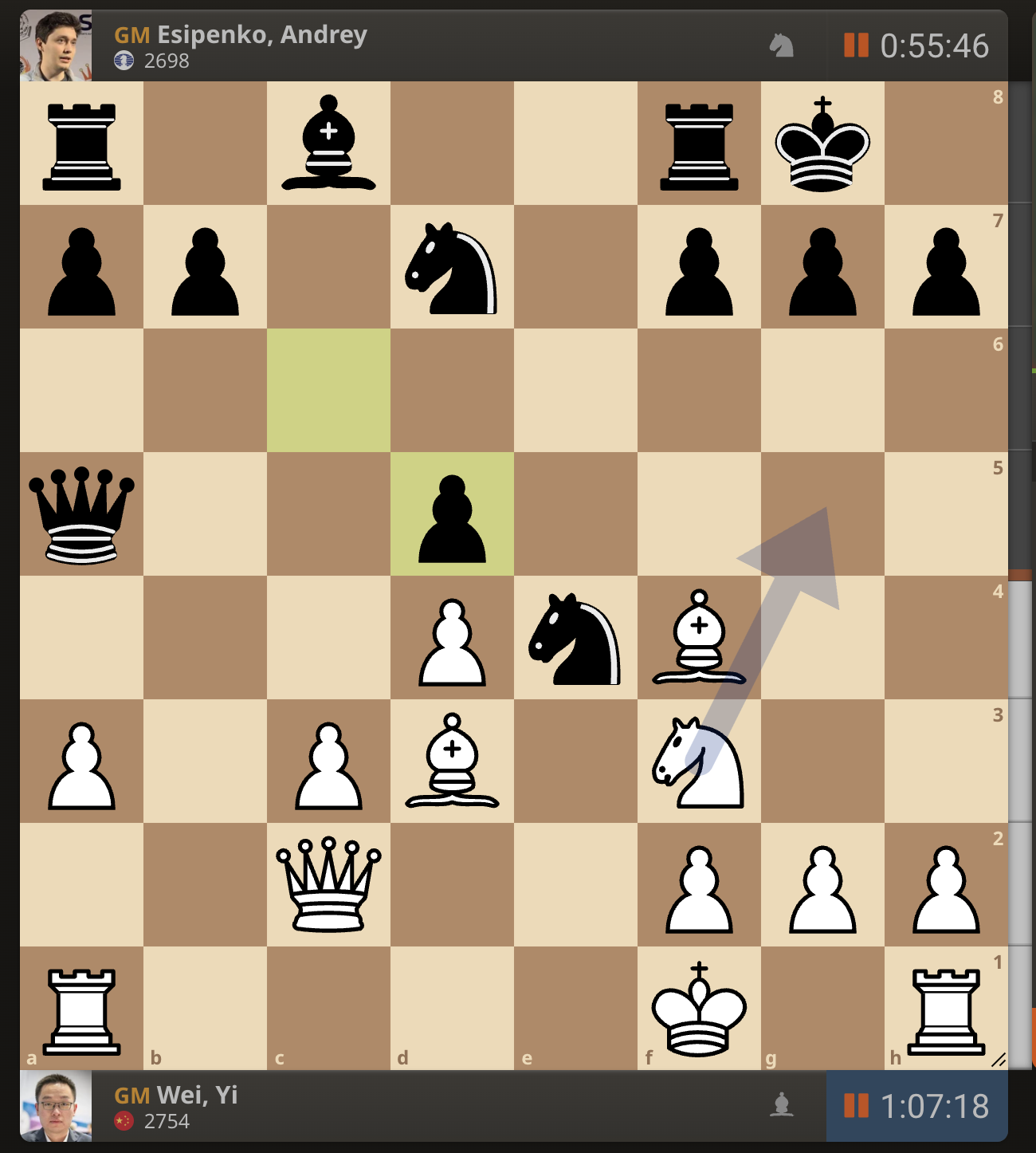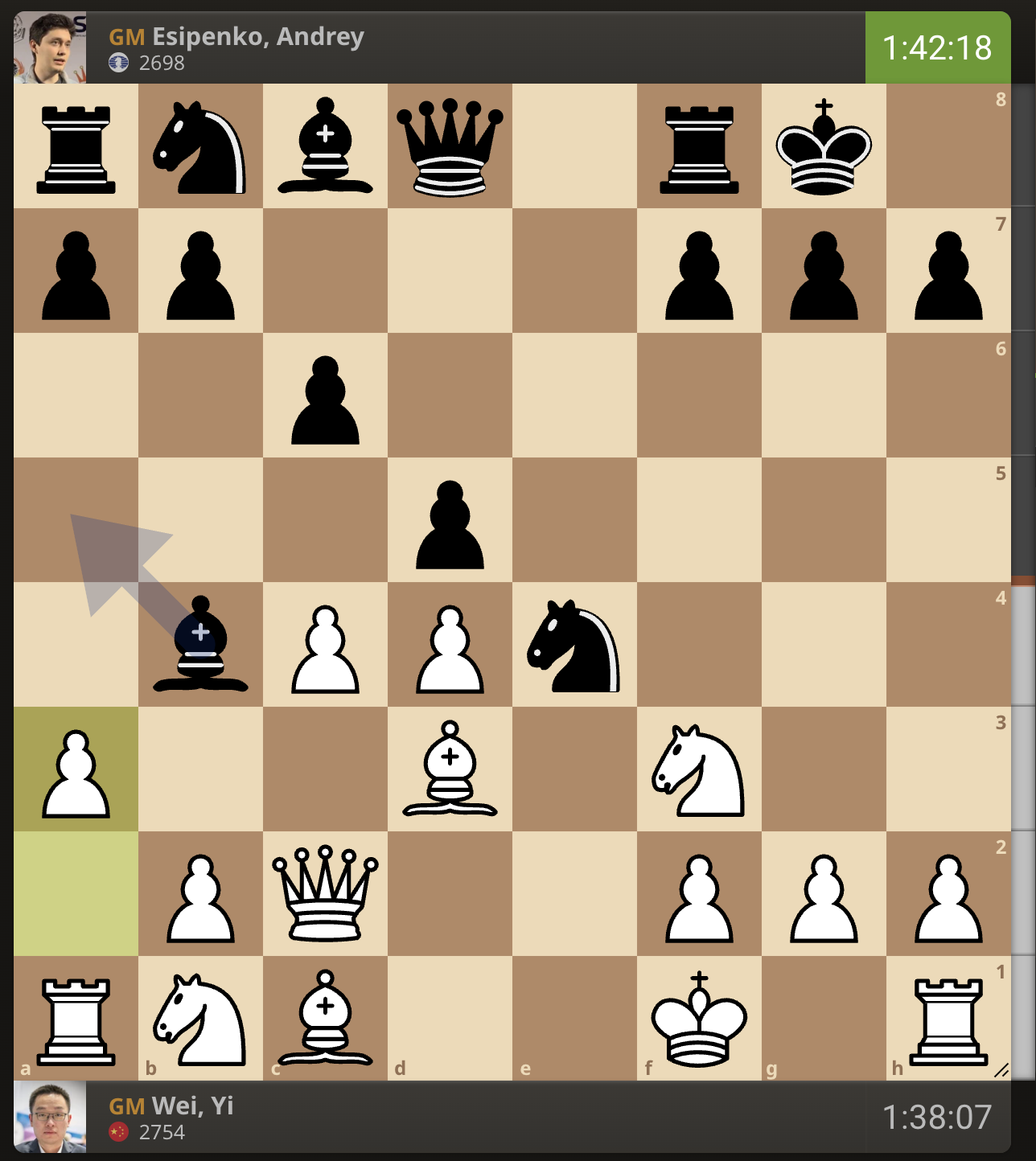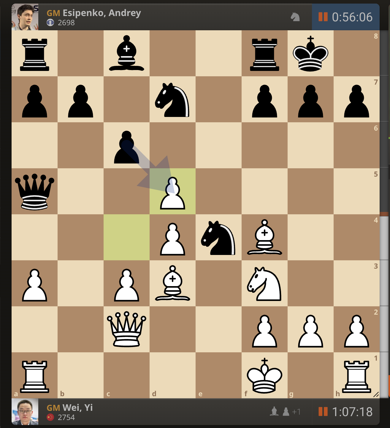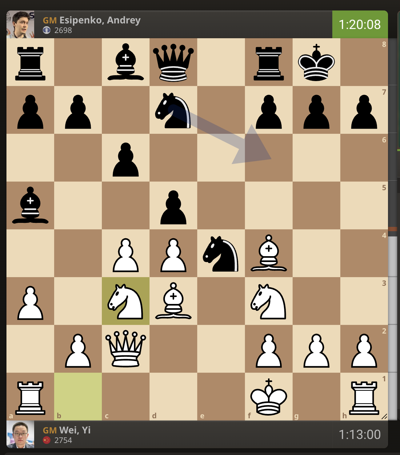 После невероятно долгого 22-минутного размышления Вэй И пошел ладьей на с3. У него осталось восемь минут, в то время как у Есипенко — 30.