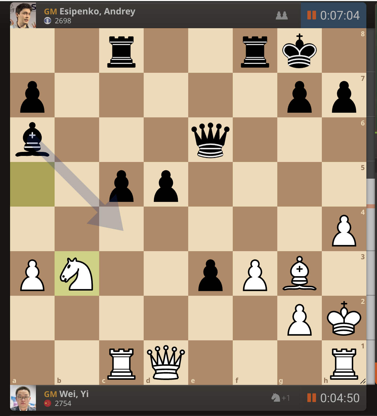Вэй И сразу отошел конем на а5. У обоих гроссмейстеров осталось мало времени, и они действуют быстро.