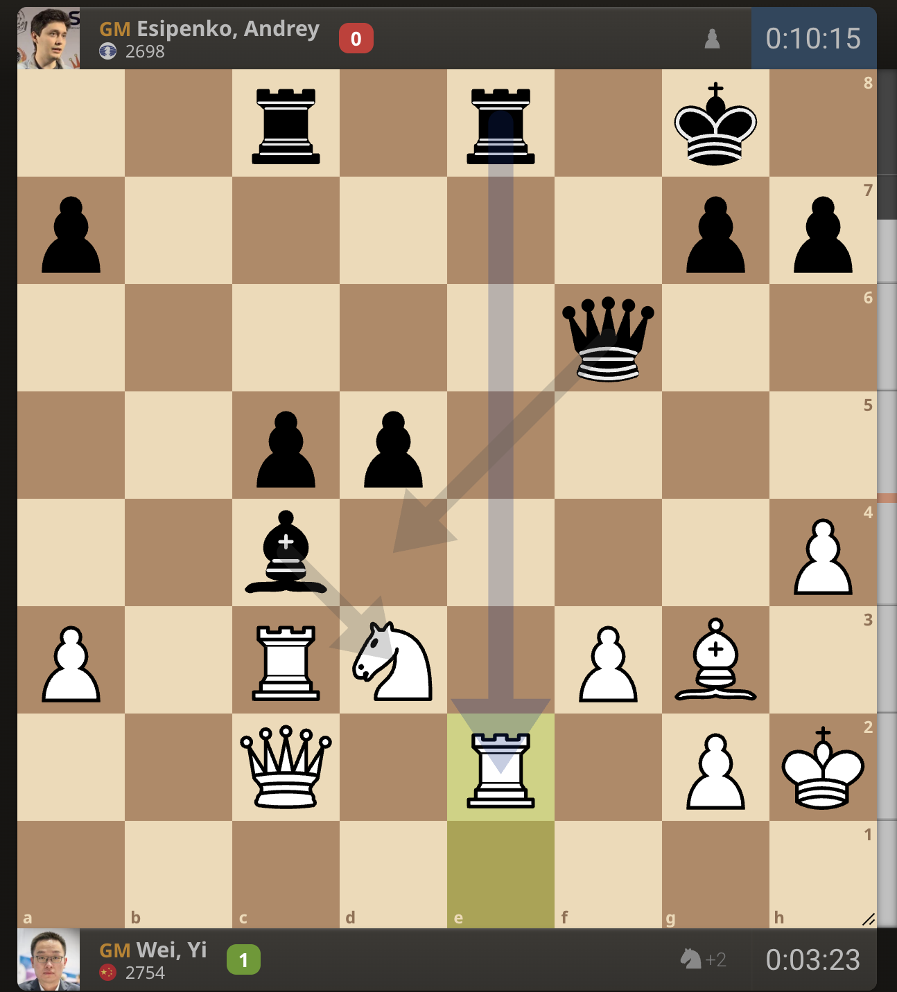 Вэй И уничтожил важнейшую пешку Есипенко на е2 своей ладьей. Российский гроссмейстер сдался.